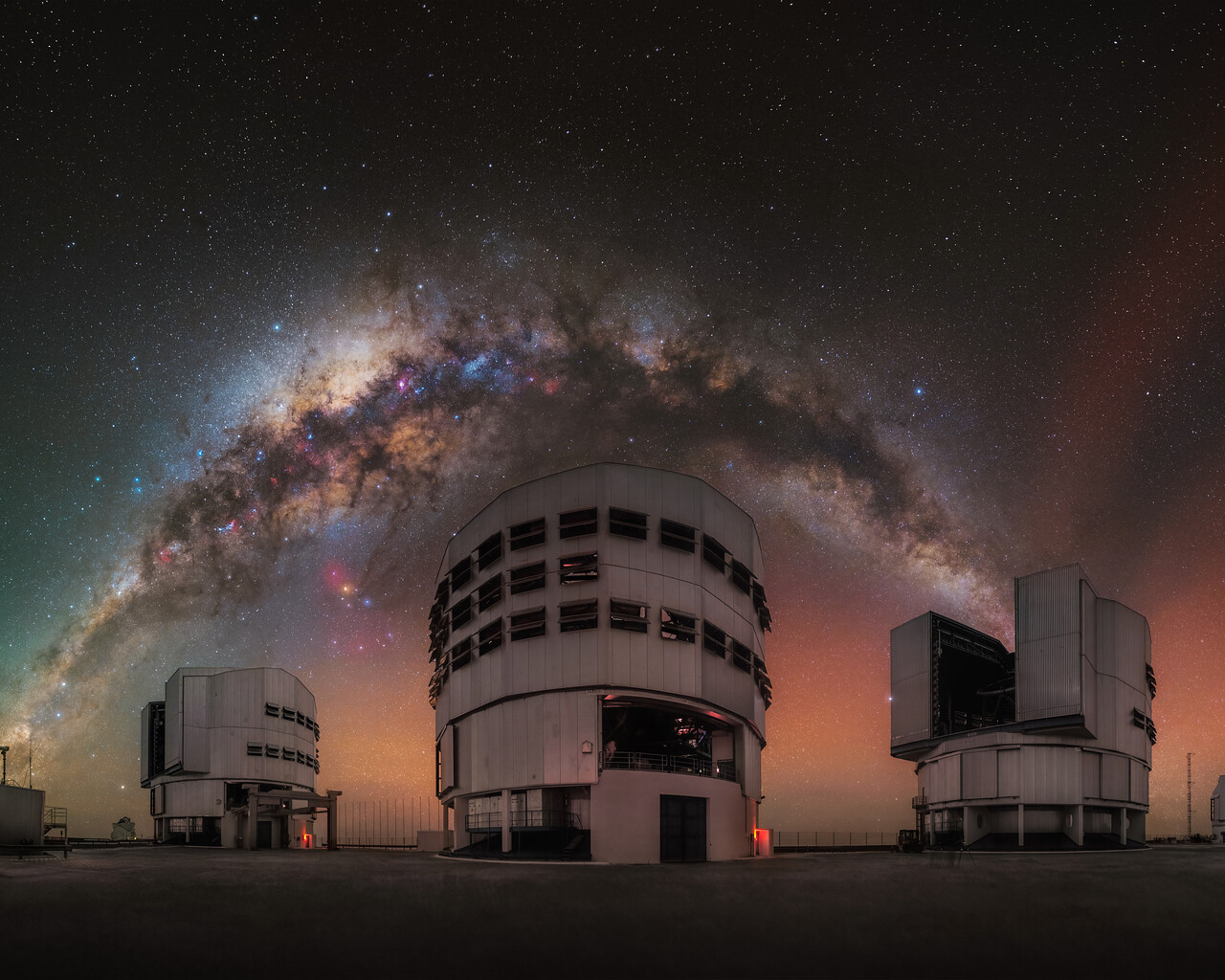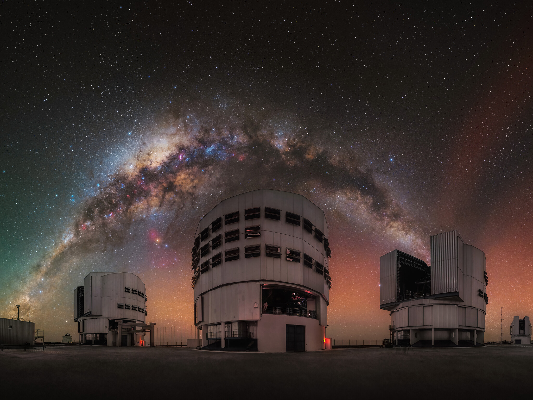 Three of the four VLT Unit Telescopes are centred under the Milky Way, while the fourth is hidden on the right side of the image. The smaller telescope in the background, to the right, is the VLT Survey Telescope (VST).