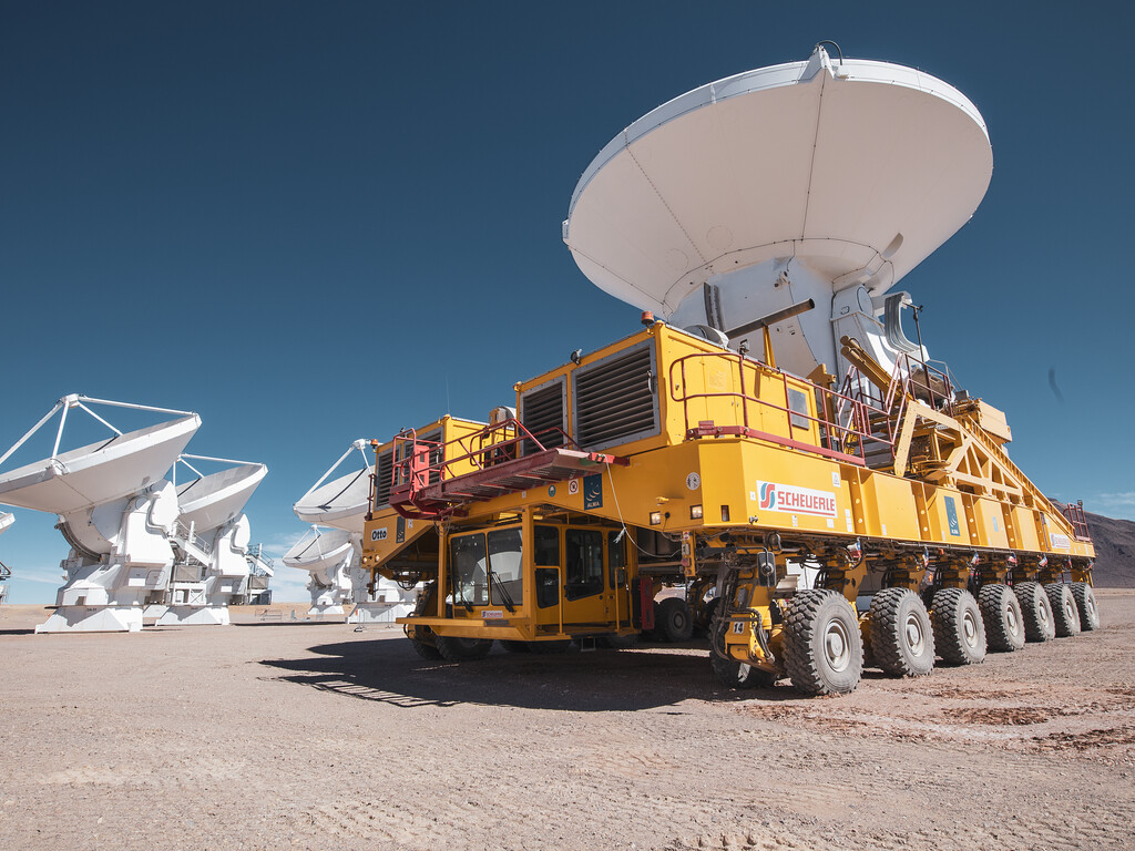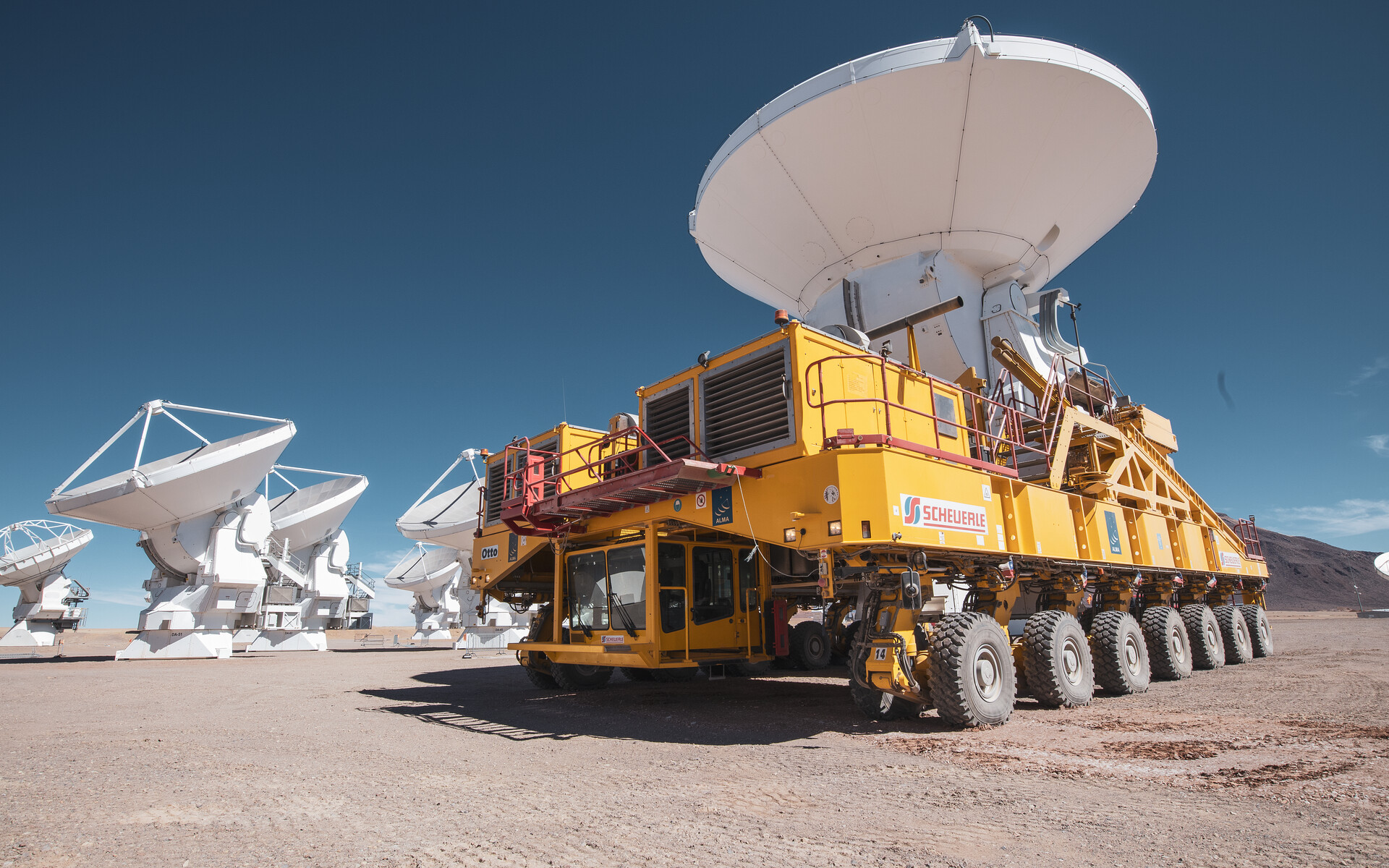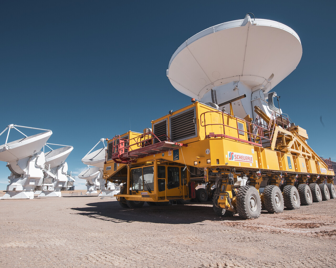 This is when the yellow trucks come into play. There are two identical ALMA transporters, named Otto and Lore, which were provided by ESO and manufactured by the company Scheuerle Fahrzeugfabrik GmbH. These vans must be powerful enough to carry an antenna weighting over 100 tons, but also accurate enough to position them with a precision of a few millimetres.