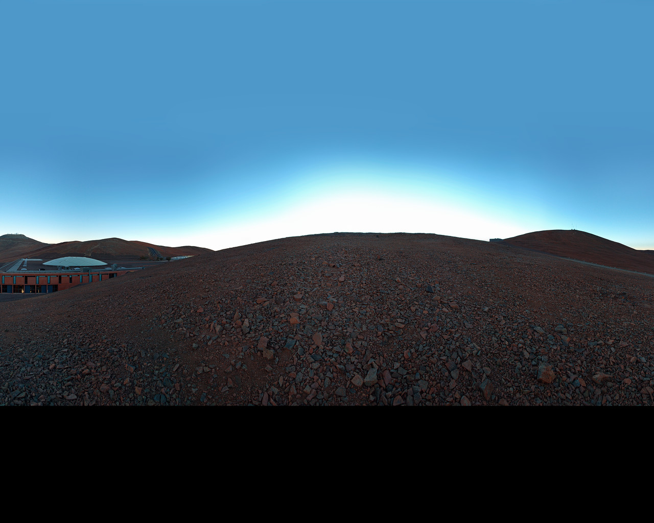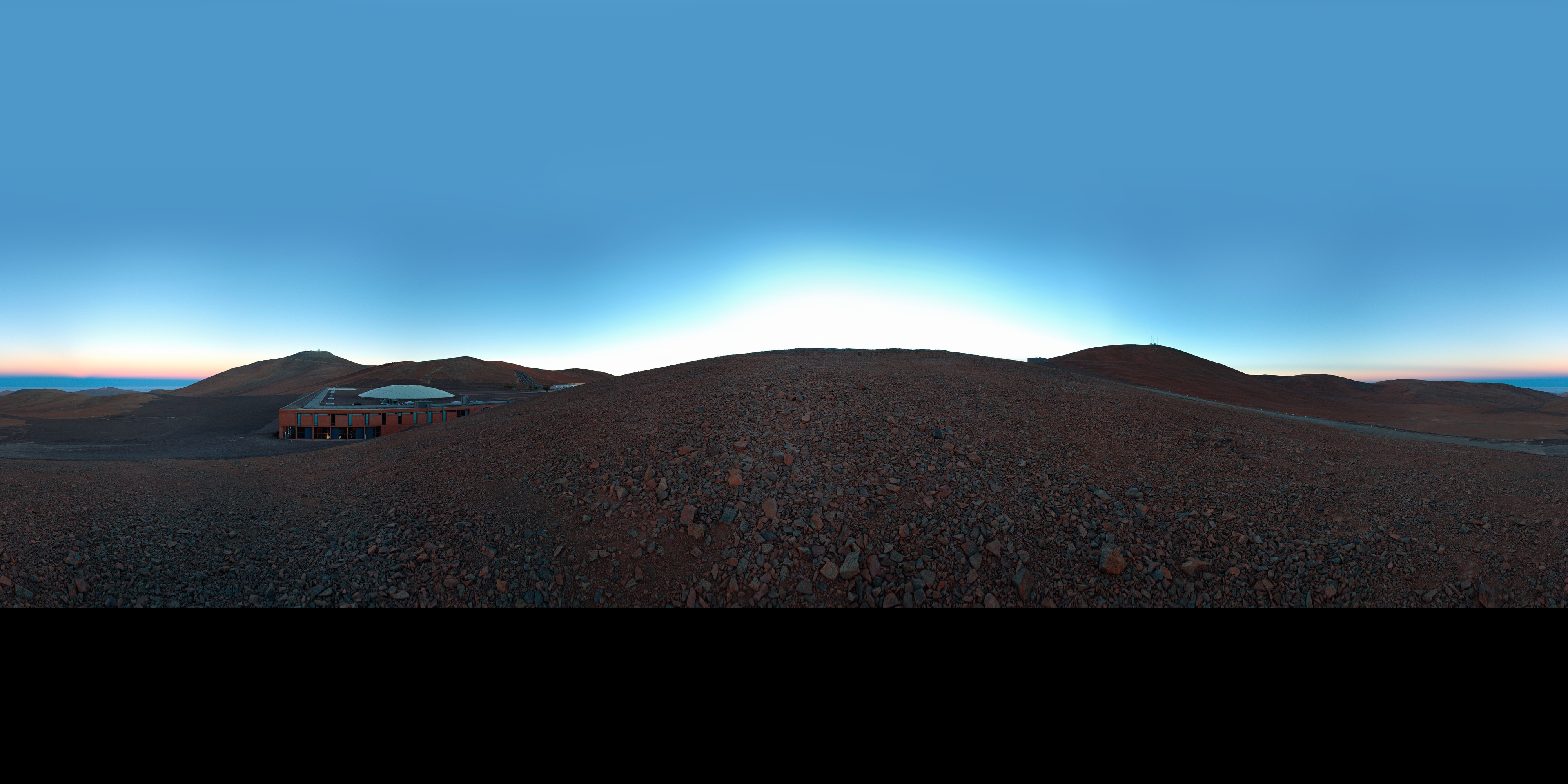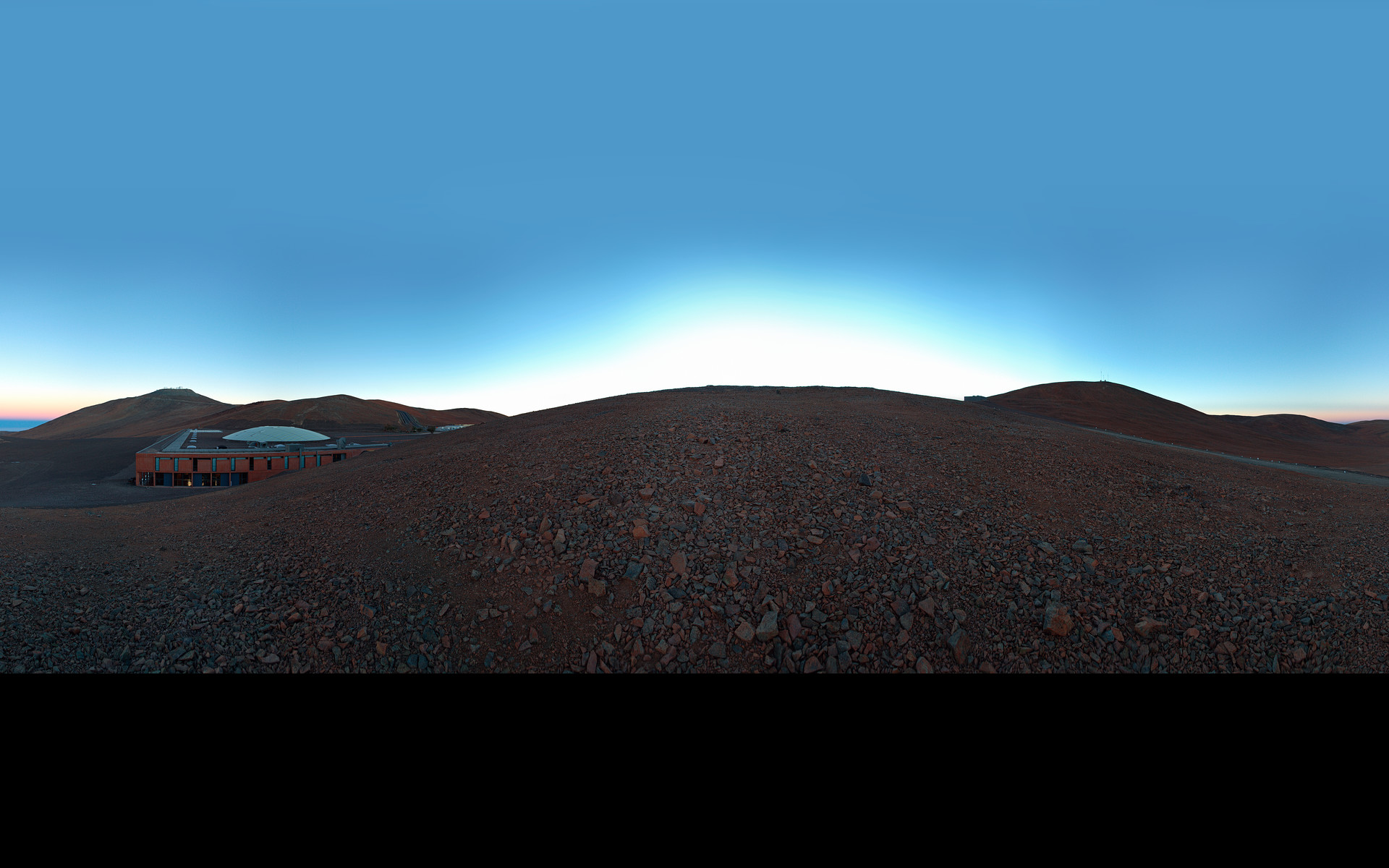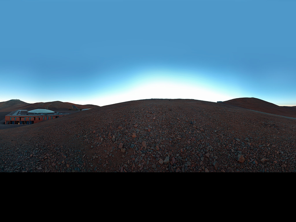 An extended to 360 x 180 degrees (with black) panorama showing a view of Paranal Observatory. To the left of the image Paranal's Residencia hotel lies sheltered by the slope of the mountain. Right behind, the Very Large Telescope (VLT) rests atop the mountain.