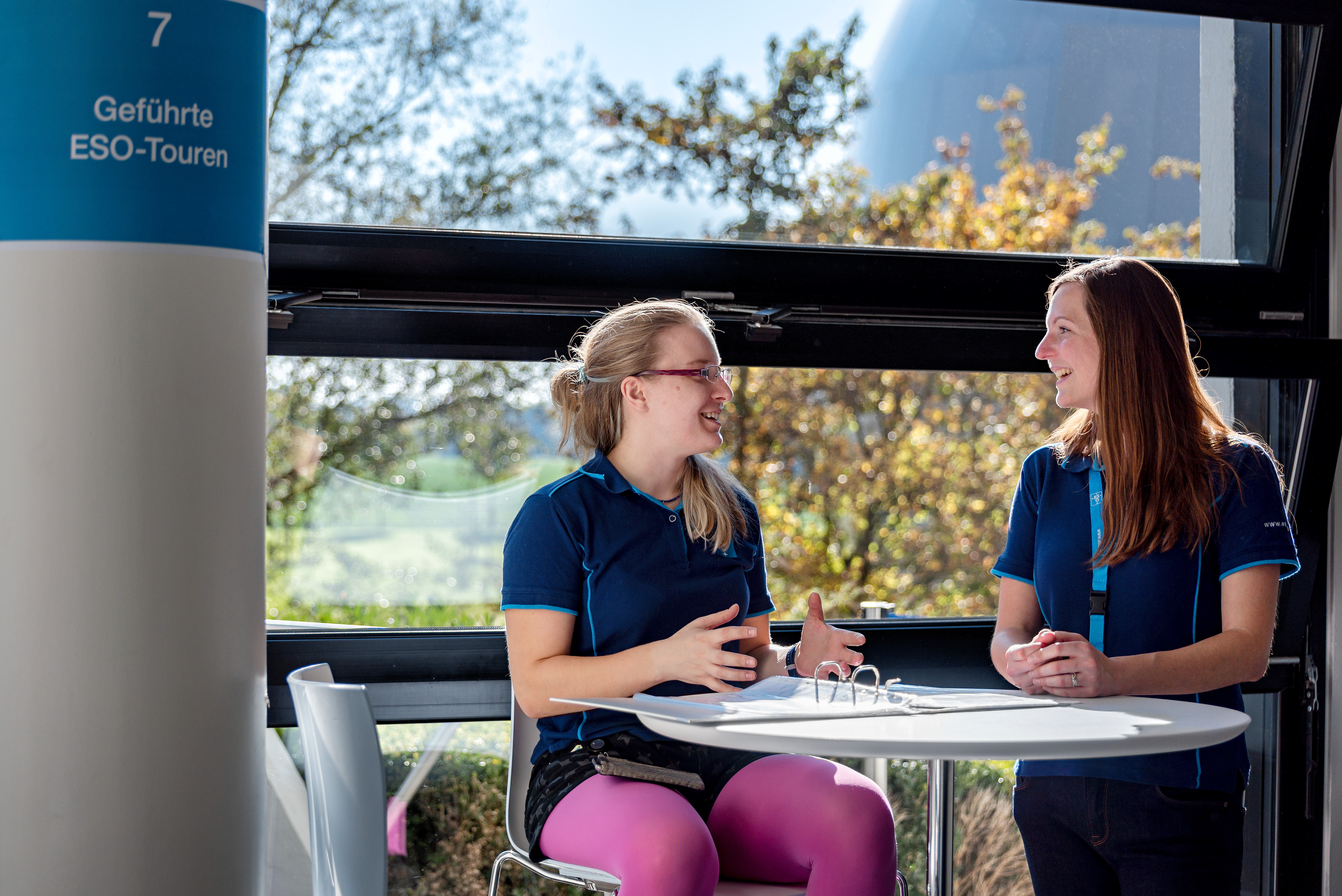 Two ESO representatives wait to give guided tours of the Headquarters to visitors on Open House Day (OHD) 2018, which took place on Saturday 13 October. Along with other institutes based at the science research centre in Garching, ESO participates in this event where the public are invited to explore the centre and learn about the research being conducted here. On OHD 2018, visitors were also able to explore the new Supernova Planetarium & Visitor Centre, which opened just a few months earlier in April. In addition to guided tours, activities included live experiments, talks from ESO scientists and a live connection to ESO's sites in Chile.