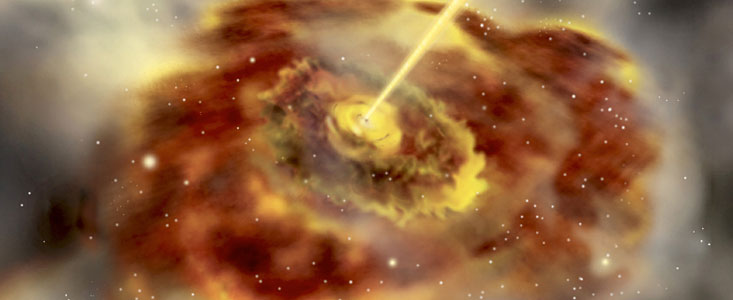 There is now much evidence that the ultimate power station of these activities originate in supermassive black holes with masses up to thousands of millions times the mass of our Sun. The black hole is fed from a tightly wound accretion disc encircling it. Material that falls towards such black holes will be compressed and heated up to tremendous temperatures. This hot gas radiates an enormous amount of light, causing the active galaxy nucleus to shine so brightly.