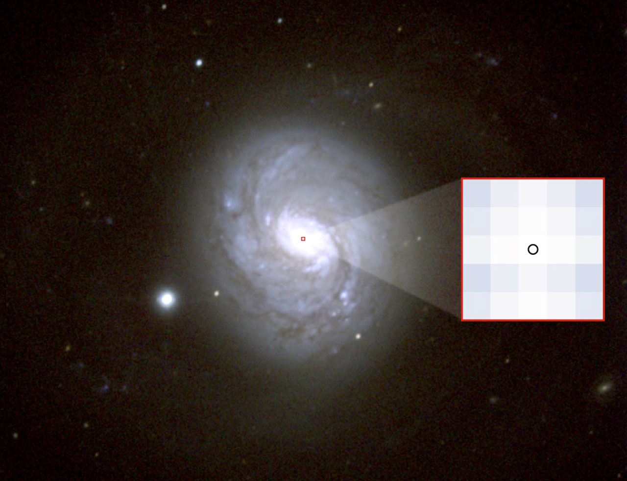 NGC 1068 is among the brightest and most nearby active galaxies. Located in the constellation Cetus at a distance of about 60 million light years, it is also known as Messier 77. It is in fact one of the biggest galaxies in Messier's catalogue and one of the first recognised spiral galaxies. On optical images, NGC 1068 looks indeed like a rather normal barred spiral galaxy. The core of the galaxy, however, is very luminous not only in the optical, but also in ultraviolet and X-ray light. A black hole with a mass equivalent to approximately 100 million stars like our Sun is required to account for the nuclear activity in NGC 1068.
