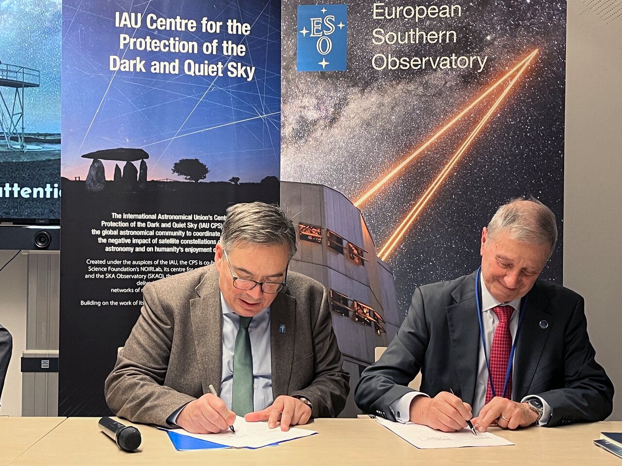 Gisteren heeft ESO een overeenkomst getekend met het Centre for the Protection of the Dark and Quiet Sky (CPS) van de Internationale Astronomische Unie (IAU) om ondersteunend partner te worden. De overeenkomst werd in Wenen ondertekend door Xavier Barcons, directeur-generaal van ESO, en Piero Benvenuti, directeur van IAU CPS, tijdens een evenement op hoog niveau over de bescherming van astronomische locaties.