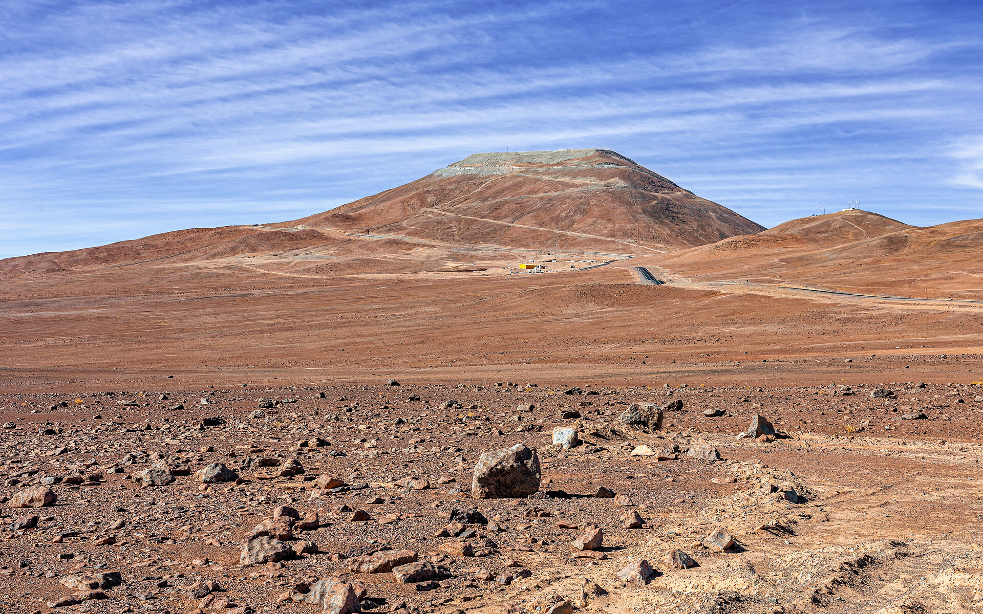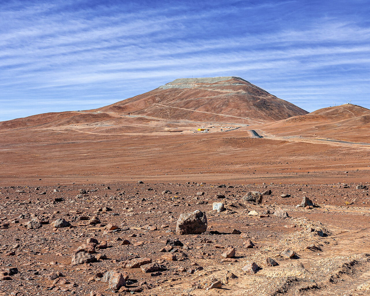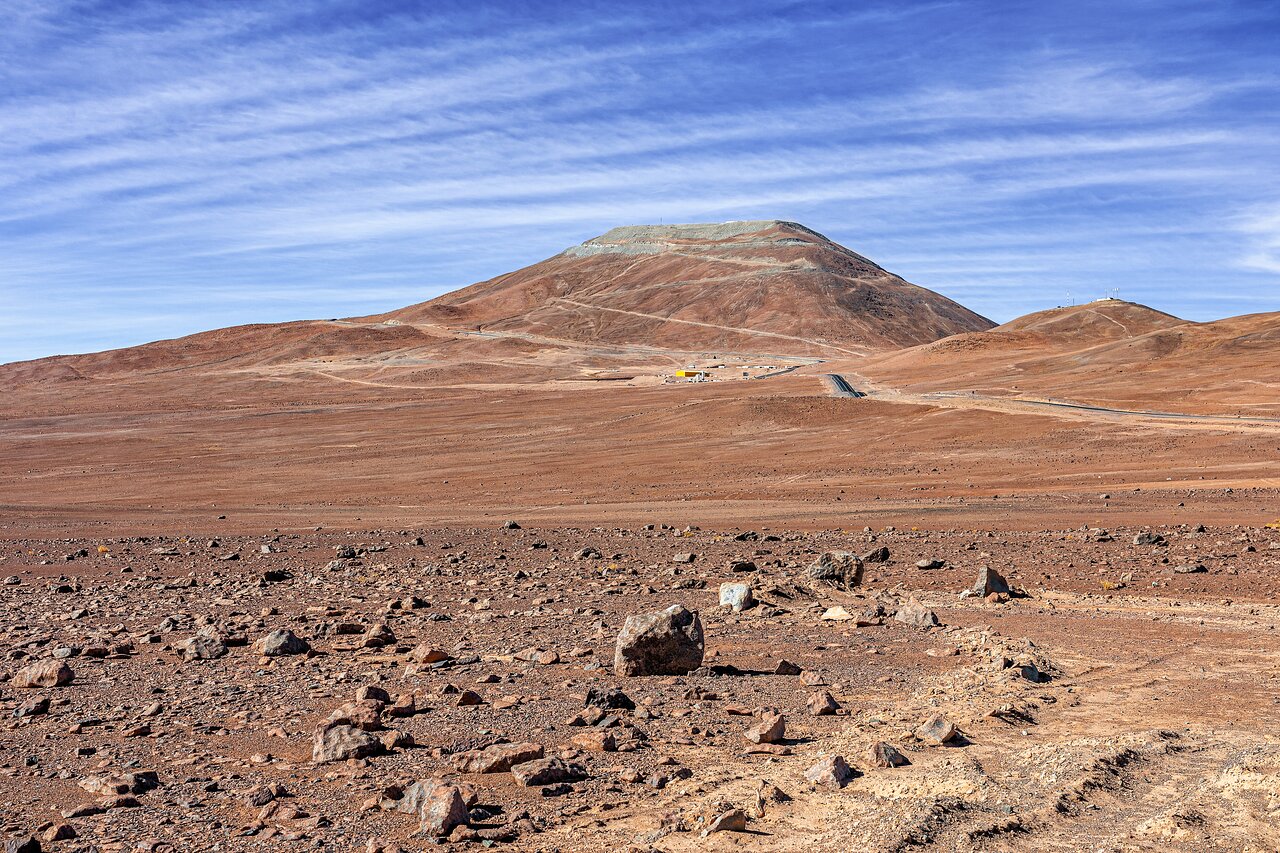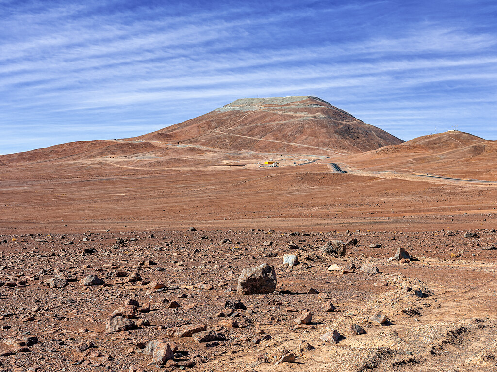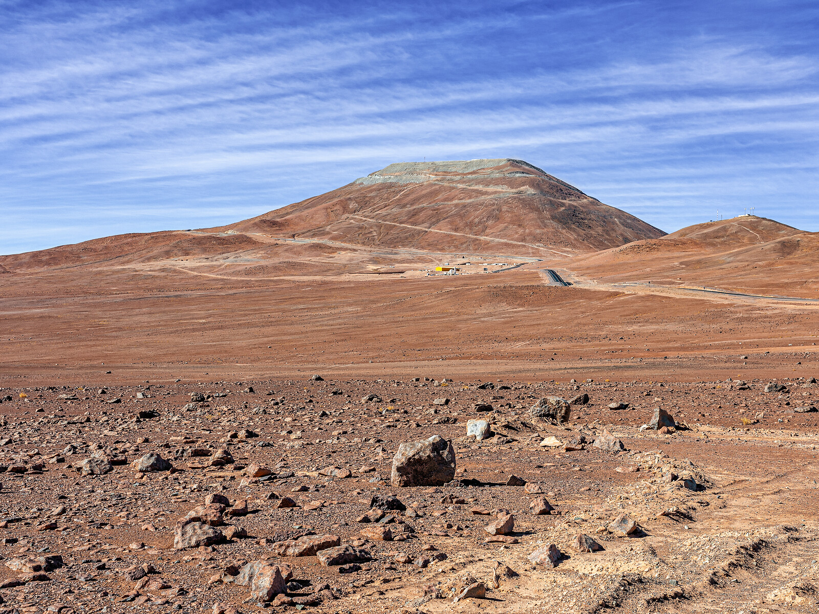 Construction of the ELT is underway in Cerro Armazones in Chile, 2019. The ELT is motivated by a wide rande of scientific challenges encountered by modern astronomy, and scientists hope its observations will uncover mysteries of the Universe. On the image, the Cerro Armazones can be seen from distance, with newly paved parts of road to the summit.