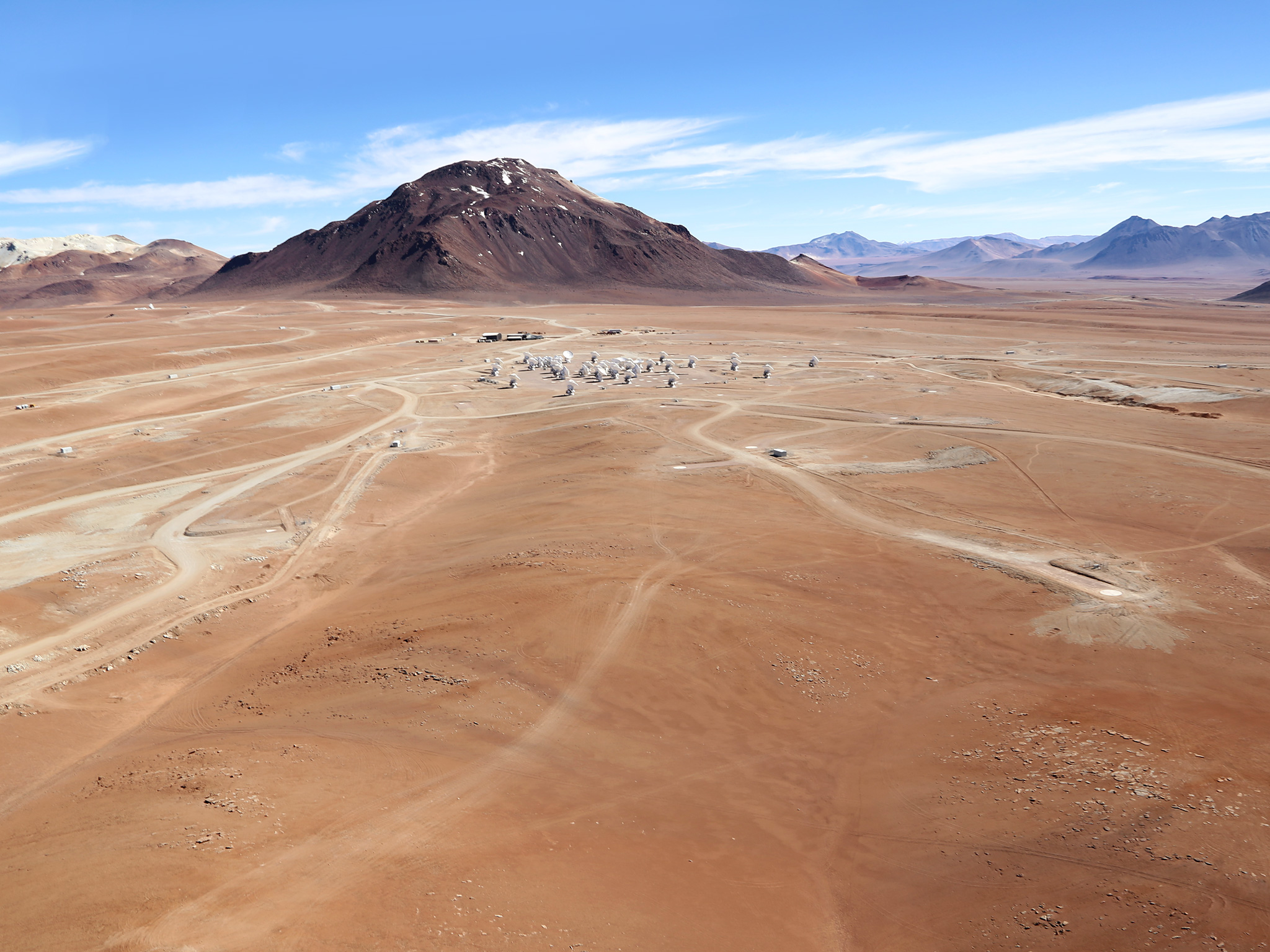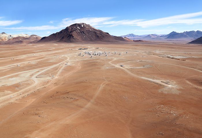 Op deze prachtige foto is de array van ALMA-antennes op de Chajnantor-hoogvlakte te zien. De array bestaat uit grote antennes met een diameter van 12 meter en de ALMA Compact Array (ACA), die bestaat uit 12 antennes met elk een diameter van 7 meter. Andere indrukwekkende luchtopnamen van de ESO-observatoria in Chili door Wings of Science worden binnenkort gepubliceerd op de ESO-webpagina's.