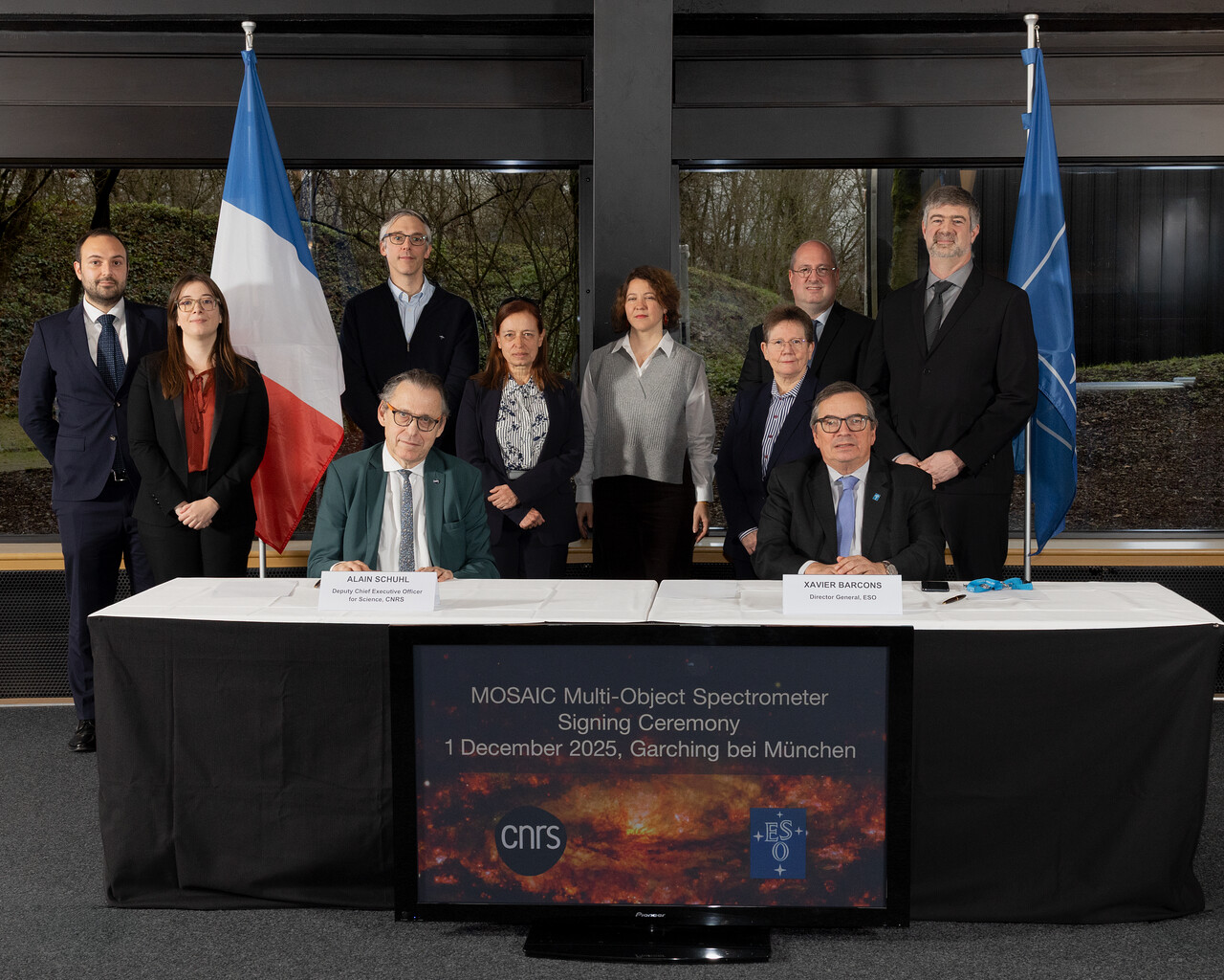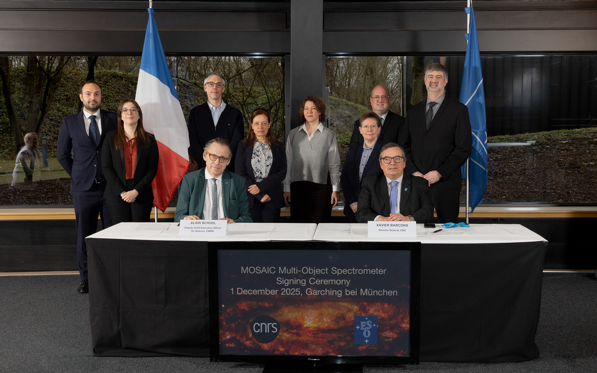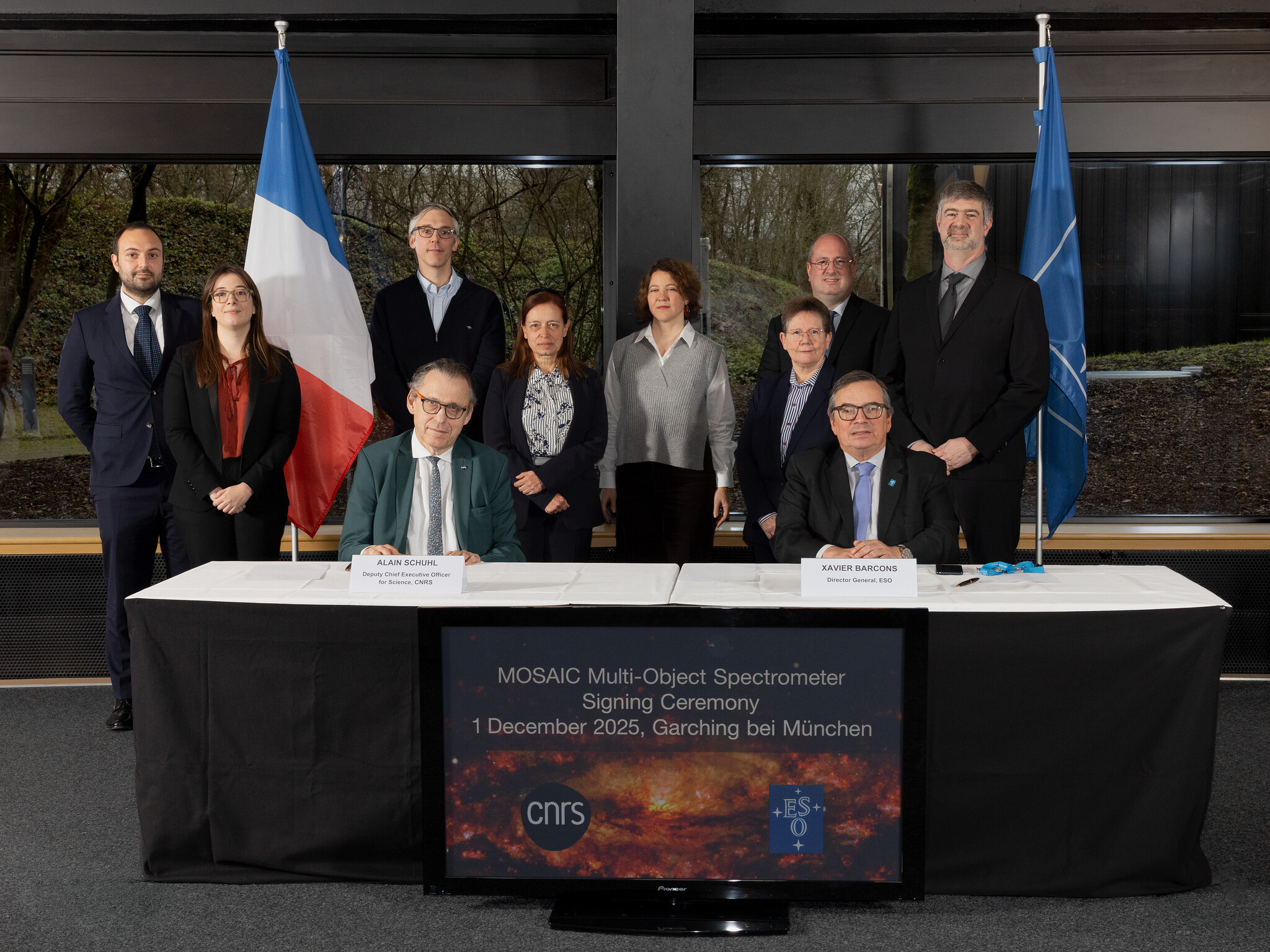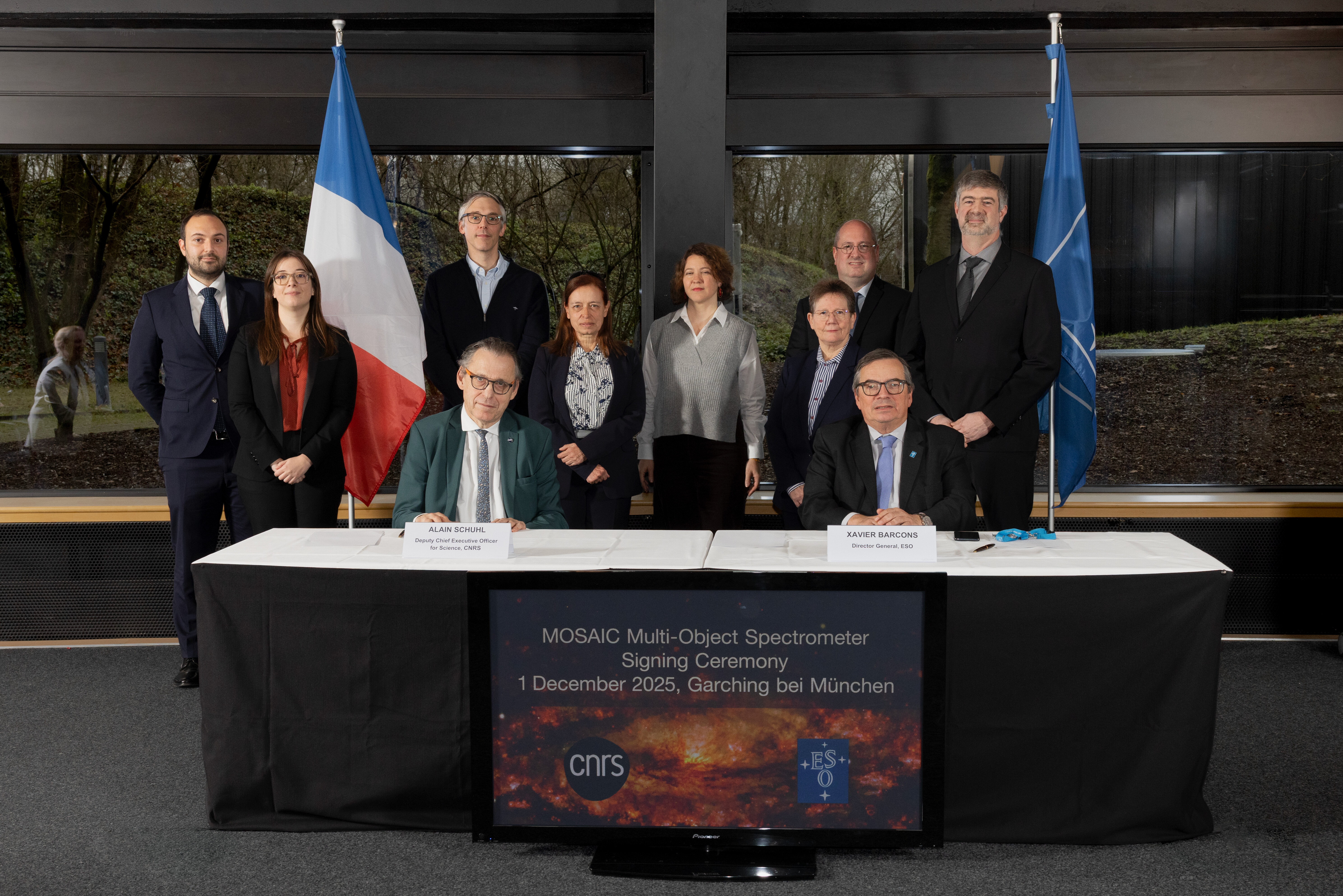 Het MOSAIC-projectteam (Roser Pello, Mathieu Puech, Myriam Rodrigues, Hermine Schnetler, Patrick Caillier, Alessandro Melo, Oliver Pfuhl, Cyrielle Blanc) bij de ondertekeningsceremonie voor het instrument. Alain Schuhl (adjunct-directeur het Office for Science, CNRS) en Xavier Barcons (directeur-generaal, ESO) staan op de voorgrond.