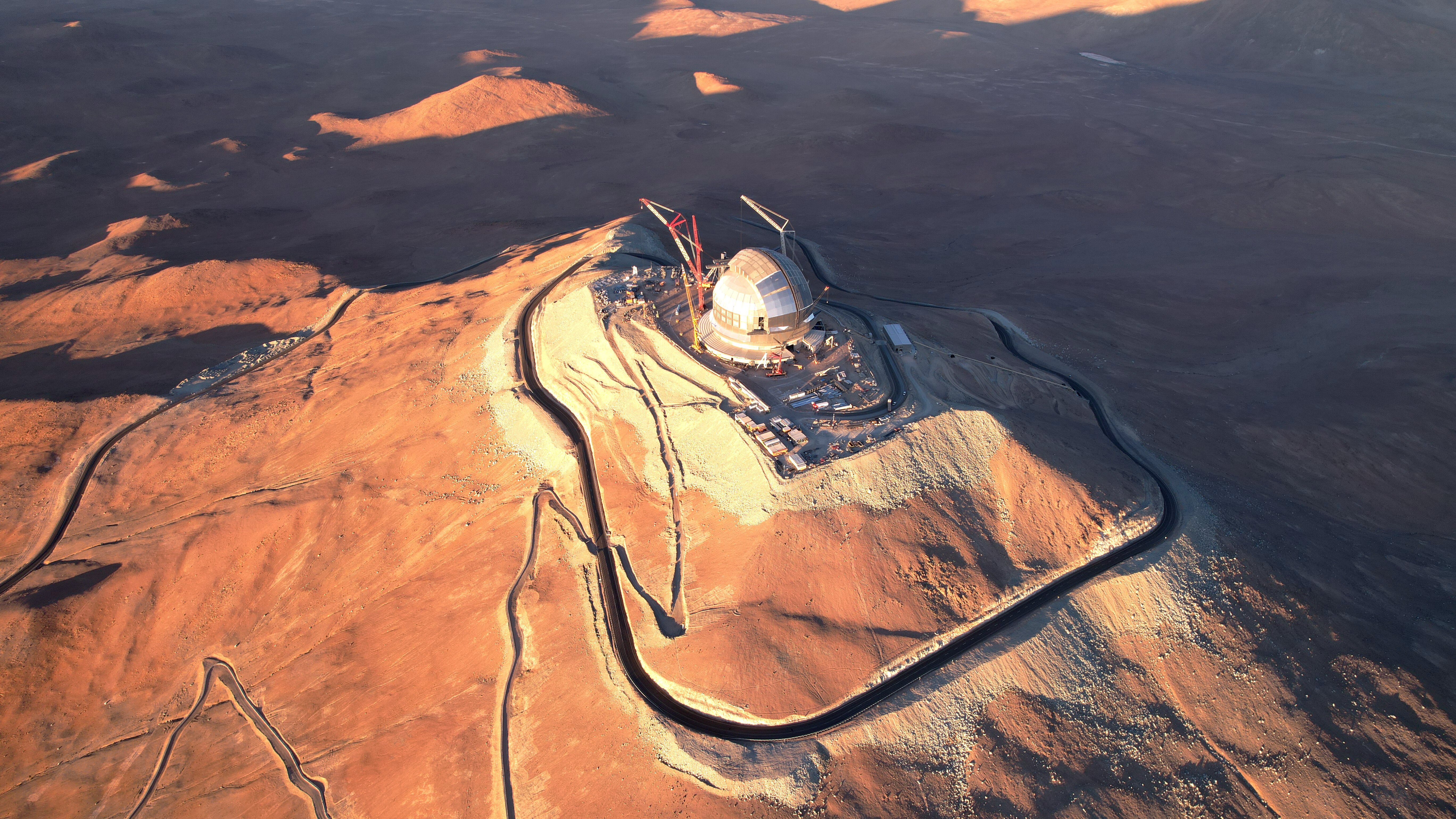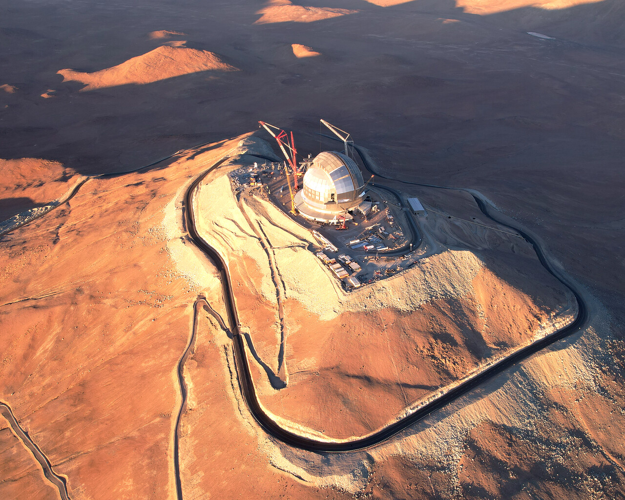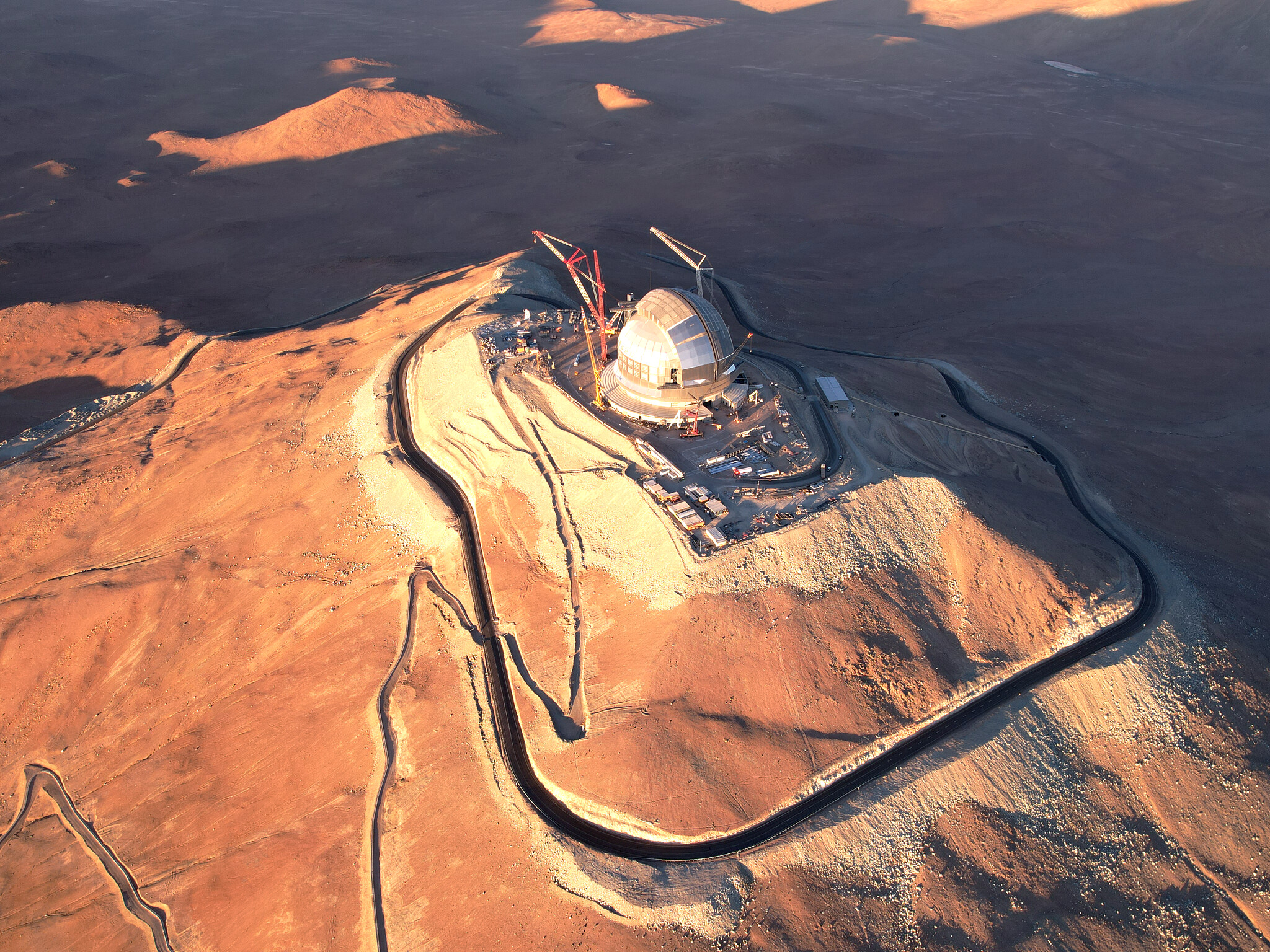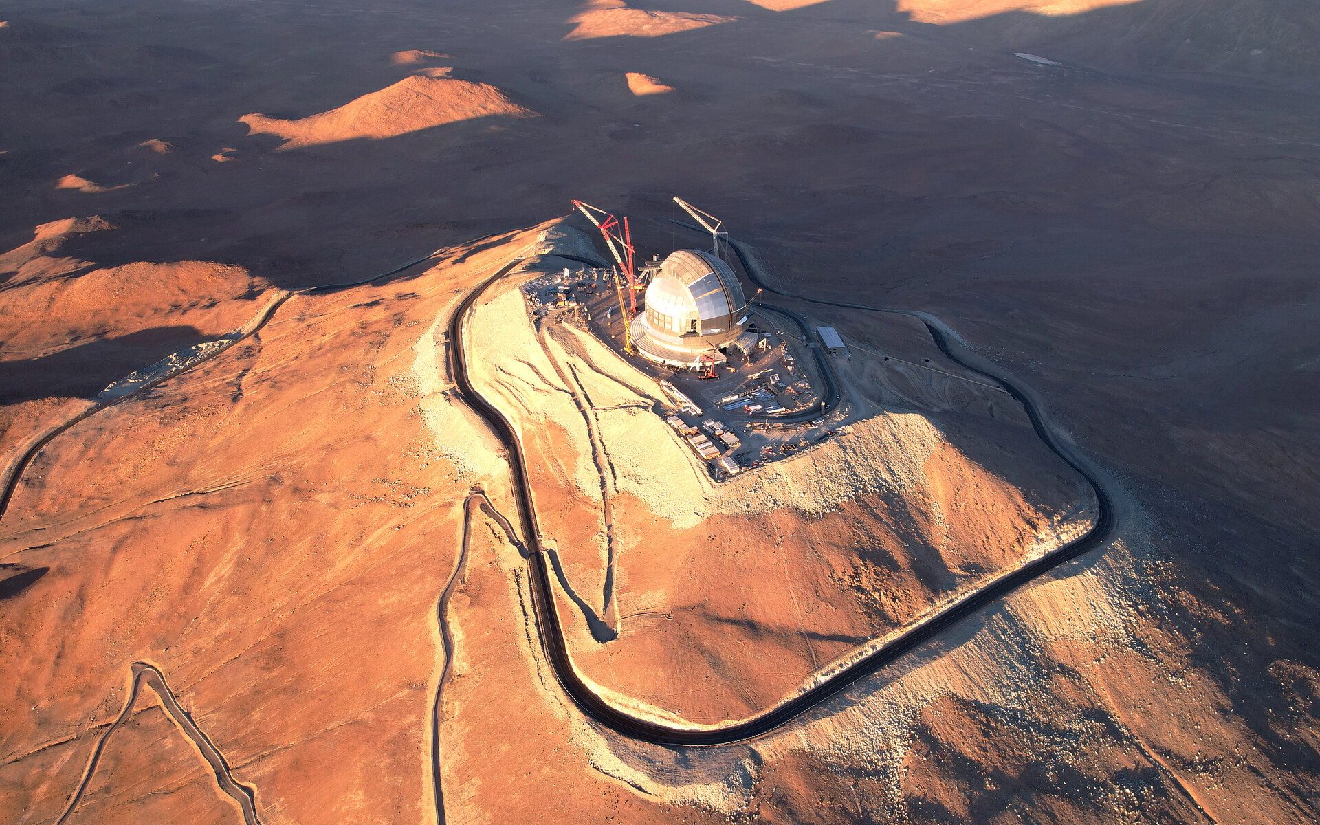 Deze dronefoto toont de Extremely Large Telescope van ESO eind 2025, tijdens de bouw.