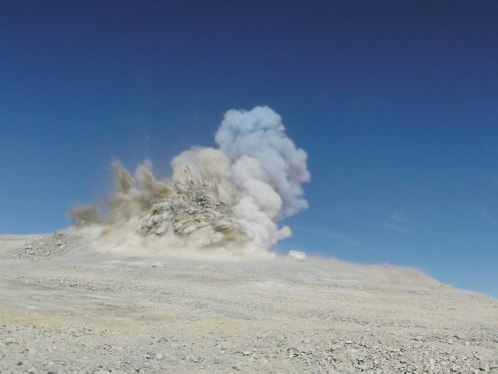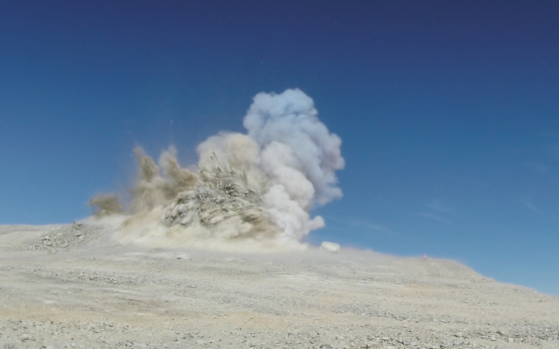 5000 kubieke meter gesteente is verwijderd, zoals deze foto van een afstand van een paar honderd meter laat zien. Het was de eerste van een reeks springwerkzaamheden waarbij in totaal 220.000 kubieke meter gesteente moet worden geruimd, om een platform van 300 bij 150 meter te realiseren.