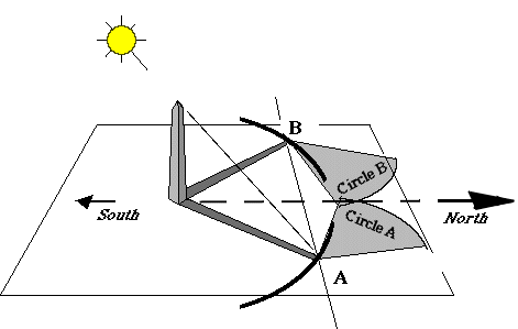 In the example above, point B is passed at 11 hours 15 minutes and point A at 13 hours 15 minutes, so the Local Noon is at 12 hours 15 minutes. This type of method is also used for nautical navigation with a Sextant.