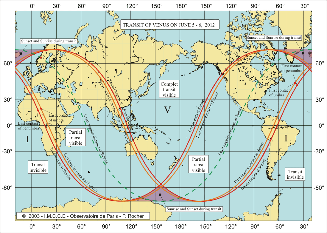 | Visibility of Venus Transit 2012 (IMCCE, Paris) Transits of Venus across the solar disk are rare events; only seven have taken place since the beginning of the 17th century. A detailed and accurate calculation by the Institut de Mécanique Céleste et de Calcul des Éphémérides (IMCCE) in Paris shows that there are exactly 82 Venus Transits between the years -3000 (BC) and 3000, that is, over a span of 6 millennia. The first of these took place on November 17, -2970, and the last one will happen on June 14, 2984. If you are interested in more details, you may consult the extensive table ("Canon of Transits") on the comprehensive CD-ROM ( "Les Rendez-Vous de Vénus" ) that was produced by the Paris Observatory and also contains more than 10,000 fascimile pages of historical documents related to transit expeditions and observations. Look here for a brief description (Word) with some examples of the pages. It is on sale at EDP Sciences. The next Venus Transits will take place in June 2012, December 2117, December 2125, June 2247, June 2255, December 2360 and December 2368. While this year's transit was optimally visible in its full duration from most of Europe, it will not be so in 2012. As the map of the visibility (above) indicates, observers in the Pacific region may follow the entire transit (weather permitting), but those in Europe will only be able to enjoy the latter part of the event. The further west they are located on that continent, the shorter will be the time interval between sunrise and the end of the transit. Still, there should be plenty of opportunities to make observations and it is very likely that the public interest will then equal, and quite possibly surpass, the enormous appeal in 2004. More information about the 2012 Venus transit is available on http://www.transitofvenus.org/. Long before that, however, the VT-2004 Final Report will have appeared, summarizing the current pilot programme and providing stimuli for the next one. It will be announced here when it becomes available in the fall of 2005. This is last "VT-2004 Theme of the Week" to be displayed here. The organisers of the VT-2004 programme wish to thank all involved for their great efforts to make this unique public programme such an outstanding success. We hope that our many visitors have enjoyed this website and the voluminous and detailed information stored here. In any case, the statistics for "www.vt-2004.org" are still impressive, e.g., nearly 10,000 sessions during November 2004 alone. | VT-2004 News December 28, 2004 : The very comprehensive VT-2004 Photo Archive has been updated and is now in its final form, with more than 600 photos. Two more thematic pages were added. December 16, 2004 : The last "Theme of the Week" has been published. November 7, 2004 : The winners of the Video Contest are known!. You will find who they are on the page of the Venus Transit Experience, a conference that summed up the vast experience gained through this unique programme. November 2, 2004 : Today, ESO Press Release 26/04 has been published. In addition to announcing the results of the VT-2004 Observing Campaign , it contains information about the "Venus Transit Experience" conference that will take place in Paris on November 5-7, 2004, bringing together the main participants in this project from many different European countries. A main aim is to discuss the impact of the project, identifying possible differences from country to country and showing how to share good practices in the future. October 29, 2004 : The full report on the determination of the distance from the Earth to the Sun (the Astronomical Unit) by means of observations of the Venus Transit on June 8, 2004, by more than 2500 groups of observers participating in the VT-2004 Observing Campaign, will appear here on Tuesday, November 2, 2004. October 6, 2004 : After viewing all the many entries received for the VT-2004 Video Contest, an international Jury has selected 10 laureate videos. The list is now available on this page. The laureates will be invited to the VT-2004 Final Event where the Jury will announce the winners of the top prizes. Congratulations to all of them! September 28, 2004 : Please note that because of the work on the Final Report about the VT-2004 programme, photos related to Venus and the transit event cannot be accepted for inclusion into the VT-2004 Photo Archive after October 15, 2004 . September 20, 2004 : The deadline for receiving entries to our Video Contest has passed and we are happy to report that many videos entered the contest. An international Jury has been set-up and will deliberate on the entries in early October. We hope to be able to announce the winners by October 15. Earlier news topics are available in the News Archive Images from the transit may now be found in different places, e.g.: