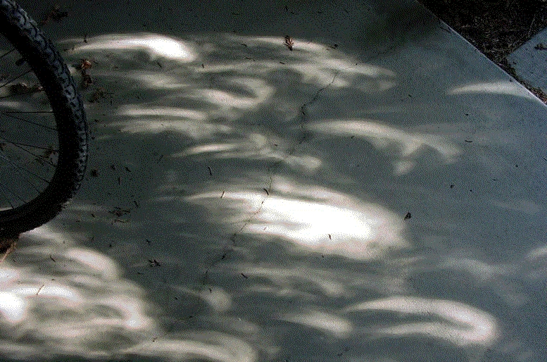 Crescent images on the Sun during the partial solar eclipse on June 10, 2002, as observed under trees on the ground. Credit Joan Barnett.