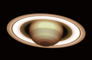 Giant planet Saturn at a distance of 1209 million km (8.08 AU). The photo is a composite of exposures in two near-infrared wavebands (H and K) and displays the intricate, banded structure of the planetary atmosphere and the rings. (ESO VLT NAOS-CONICA Adaptive Optics instrument on December 8, 2001).
