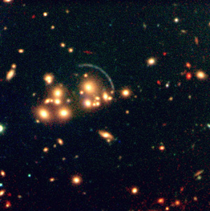 A distant cluster of galaxies, known as "Cl2244-02". The long arc is a "gravitational arc", i.e. the distorted image of a galaxy seen in that direction, but located far behind this cluster. The distortion is caused by the clusters' gravitational field. One method for distance determination is based on this particular effect. The photo is a composite of three exposures in different visual and infrared wavebands (colours). (ESO VLT Test Camera + ISAAC multi-mode instrument; 1998).