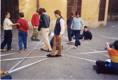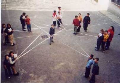 This situation can be modelled with a simulation activity in a large outdoor area. The focus is on the position of Venus with respect to the Sun and the zodiacal constellations. (pentagram picture No. 3) Two students move simultaneously along the orbits of Venus and the Earth (large concentric circles divided into 7 and into 12) for 19 steps or months (= 1 cycle), repeated five times. At each cycle, the Earth goes 7 steps ahead (19 steps modulo 12); Venus goes 5 steps (19 steps modulo 7). For an observer on the Earth, after five cycles (5 by 19 months = 8 years), Venus has the same position with respect to the Sun and the zodiacal constellations. In eight years Venus has made 13 revolutions around the Sun (8 years/224 days = 13 times) and the Earth eight. The pentagram can be highlighted with coloured string (link picture No. 4)