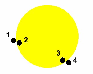 - The second contact is an interior contact ("2" on Figure 1) between Venus and the limb of the Sun. This one is easy to observe; as soon as Venus enters the solar disk, be prepared to measure the instant of the second contact. It will take about 20 minutes for Venus to move from the first contact to the second contact, so there is plenty of time. However, you must pay attention to the "black drop" phenomenon. This effect is due to the diffraction of light which causes Venus to be "stuck" to the limb of the Sun, as if with some kind of chewing-gum! This is illustrated in Figure 2. The "black drop" phenomenon is further explained on a special page that also contains hints on how to improve the accuracy of your timing despite this problem.
