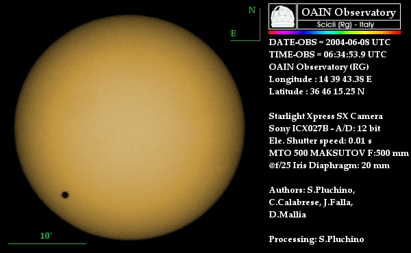 Salvo Pluchino OAIN Observatory MTO 500 Maksutov f=500mm Starlight Xpress SX Camera Sony ICX027B; 0.01 sec June 8, 2004, 06:34:53.9 UT Scicli (RG), Italy |