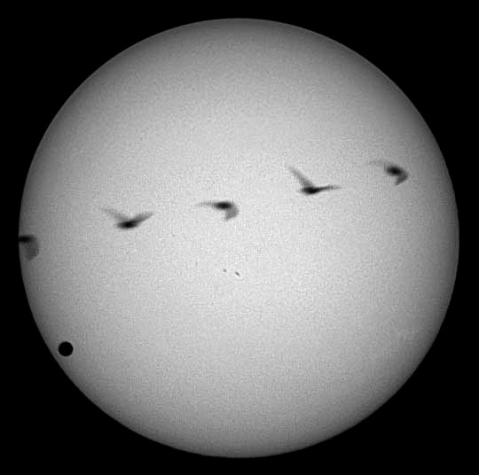 Nick King Konus 80mm short tube refractor Philips ToUcam Pro SC3 Astronomik 13nm H-alpha filter 10fps with AstroImager [Composite shot of 5 separate frames of the same bird flying across the face of the Sun] June 8, 2004 United Kingdom |