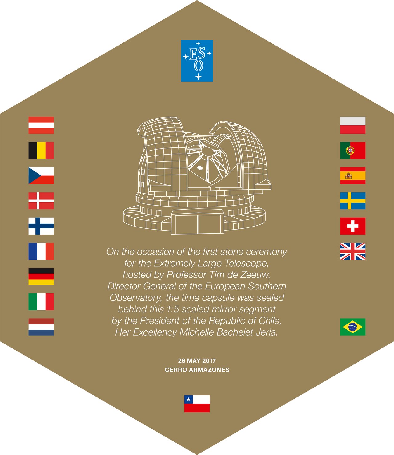 W programie uroczystości było zaplombowanie kapsuły czasu przygotowanej przez ESO. Umieszczono w niej plakat ze zdjęciami obecnych pracowników ESO i kopię książki opisującej przyszłe cele naukowe teleskopu. Okładkę kapsuły stanowi wygrawerowany sześciokąt wykonany z Zeroduru, w skali jednej piątej modelu jednego z segmentów zwierciadła głównego ELT.