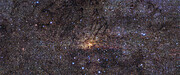 Esta imagem composta compara uma imagem de grande angular no visível (obtida no âmbito do Digitized Sky Survey 2) das regiões centrais da Via Láctea com uma nova imagem no infravermelho próximo obtida com o instrumento HAWK-I montado no Very Large Telescope do ESO. Enquanto a imagem da esquerda (no visível) se encontra repleta de estrelas, ao deslocarmos a barra verde revelamos ainda mais estrelas (imagem no infravermelho próximo), escondidas por detrás de nuvens de poeira.