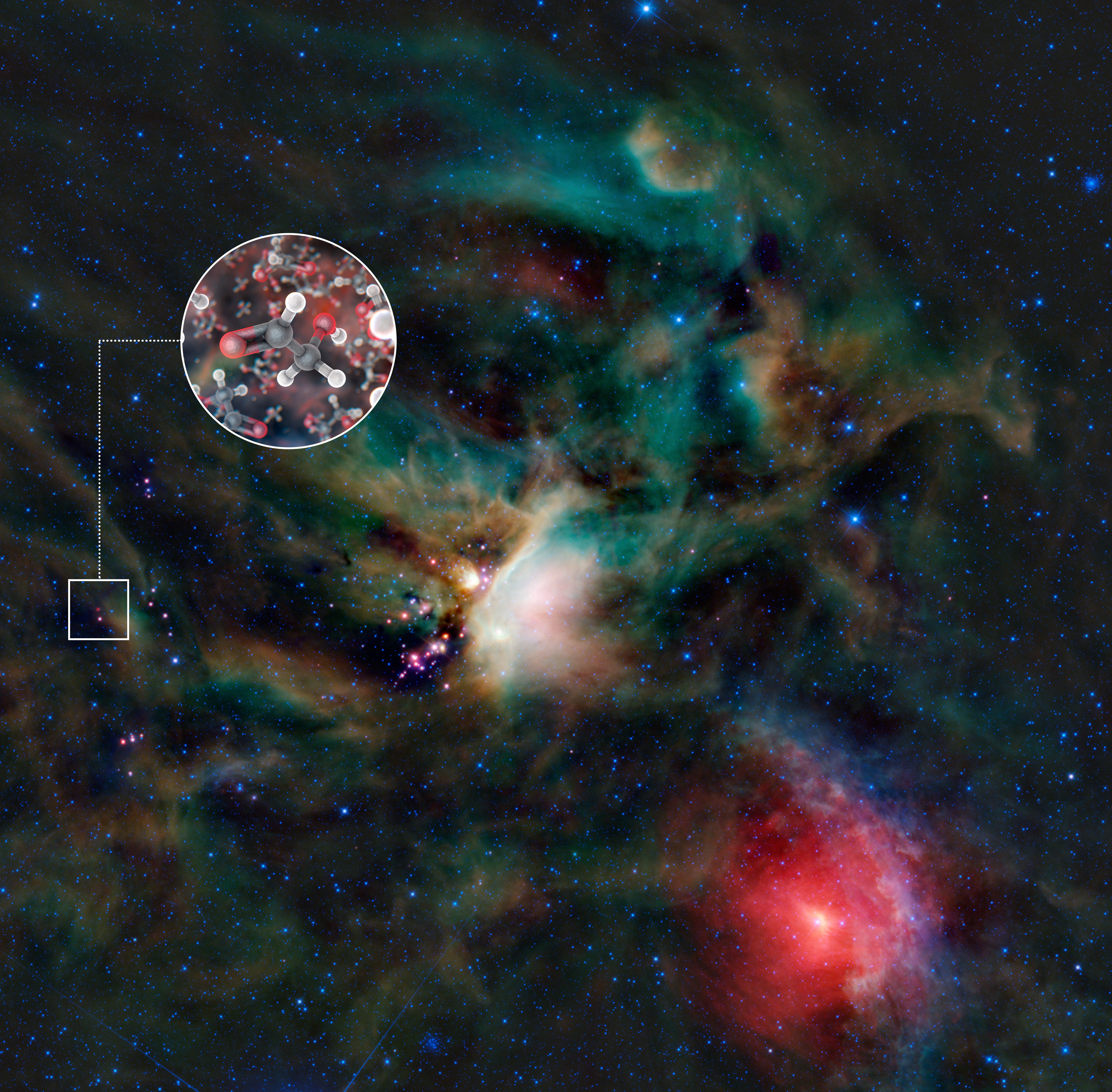 Esta imagem mostra a região de formação estelar Rho Ophiuchi no infravermelho, obtida pelo Wide-field Infrared Explorer (WISE) da NASA. A IRAS 16293-2422 é o objeto vermelho no centro do pequeno quadrado. A imagem sobreposta é uma impressão artística das moléculas de glicoaldeído, mostrando a estrutura molecular deste composto (C2H4O2). Os átomos de carbono estão representados a cinzento, os de oxigénio estão a vermelho e os de hidrogénio encontram-se a branco.