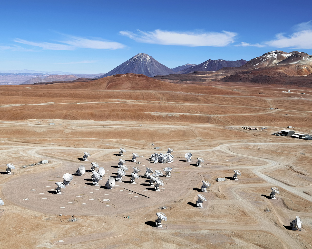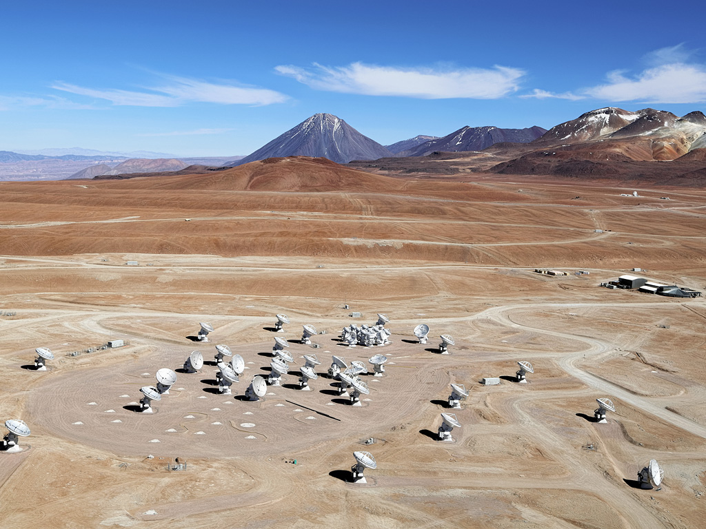 Esta imagem mostra uma vista aérea do planalto do Chajnantor, situado a uma altitude de 5000 metros nos Andes chilenos, onde a rede de antenas ALMA está localizada. As antenas maiores têm 12 metros de diâmetro, enquanto as doze mais pequenas têm 7 metros de diâmetro e constituem a Rede Compacta. No horizonte, os picos principais, da direita para a esquerda, são: Cerro Chajnantor, Cerro Toco e Juriques. Esta fotografia foi tirada em dezembro de 2012, quatro meses antes da inauguração do ALMA.