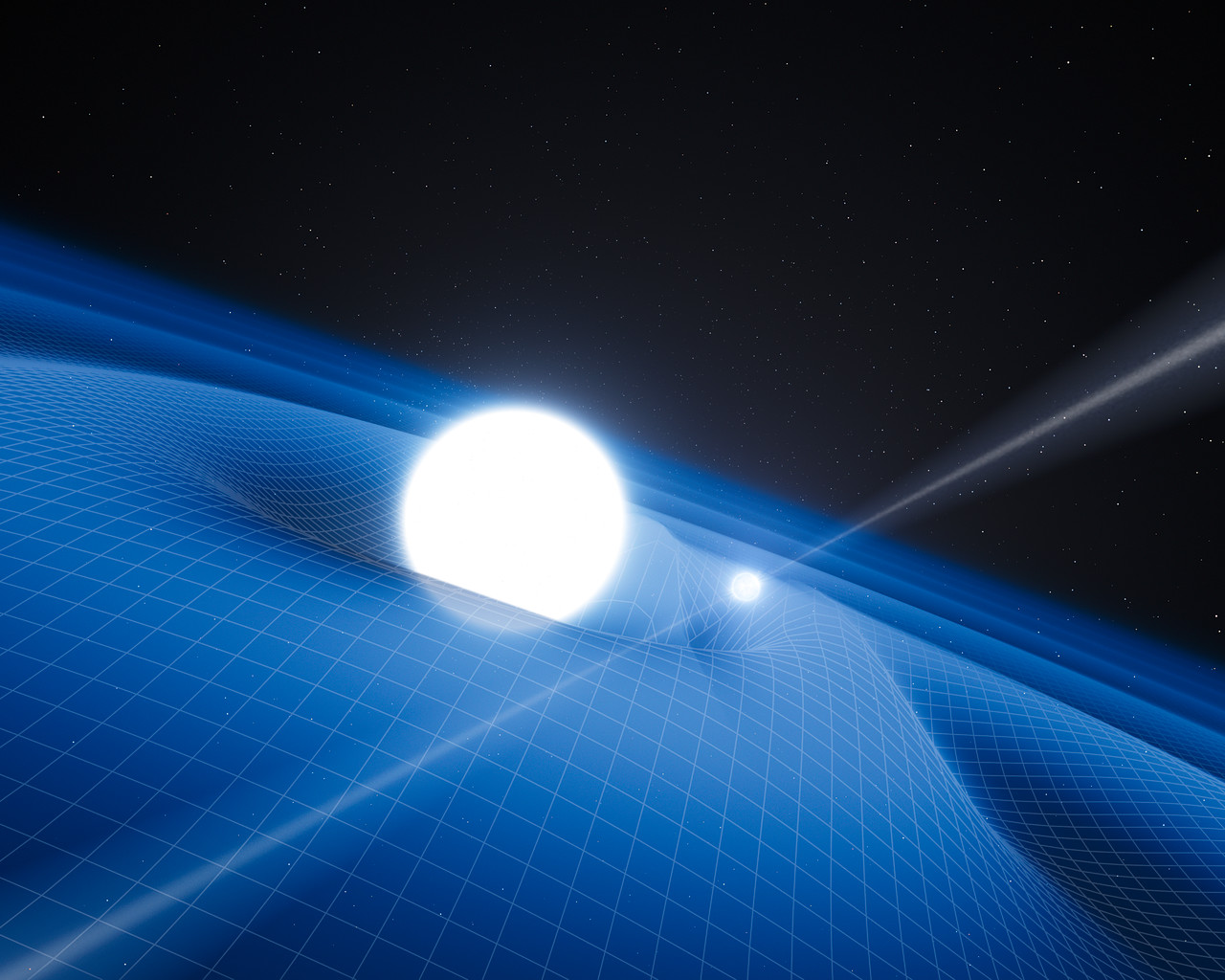 O sistema emite radiação gravitacional, ondas no espaço-tempo. Embora estas ondas (apresentadas como a grelha da imagem) não possam ser detectadas directamente pelos astrónomos a partir da Terra, podem no entanto, ser sentidas indirectamente ao medir a variação da órbita do sistema à medida que este perde energia.