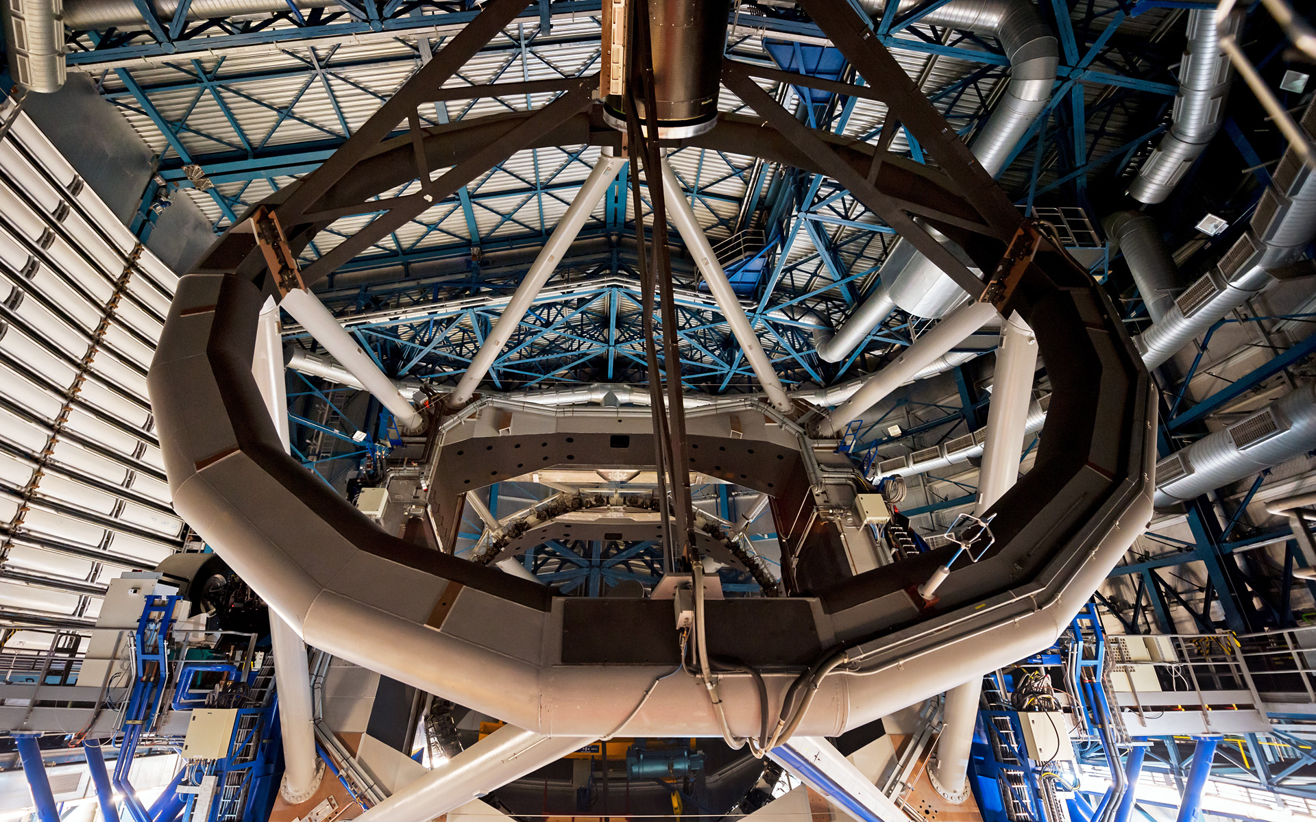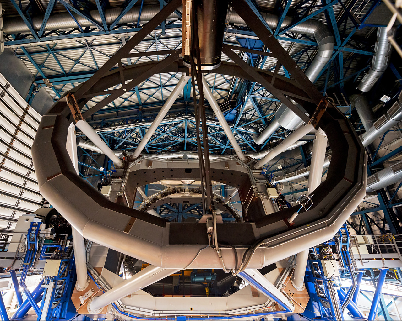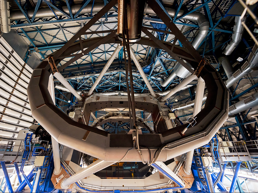 O interior da cúpula de um dos telescópios gigantes do Very Large Telescope do filme Hidden Universe, lançado em cinemas IMAX e cinemas de ecrã gigante em todo o mundo e produzido pela companhia de produção australiana December Media, em associação com Film Victoria, Swinburne University of Technology, MacGillivray Freeman Films e o ESO.