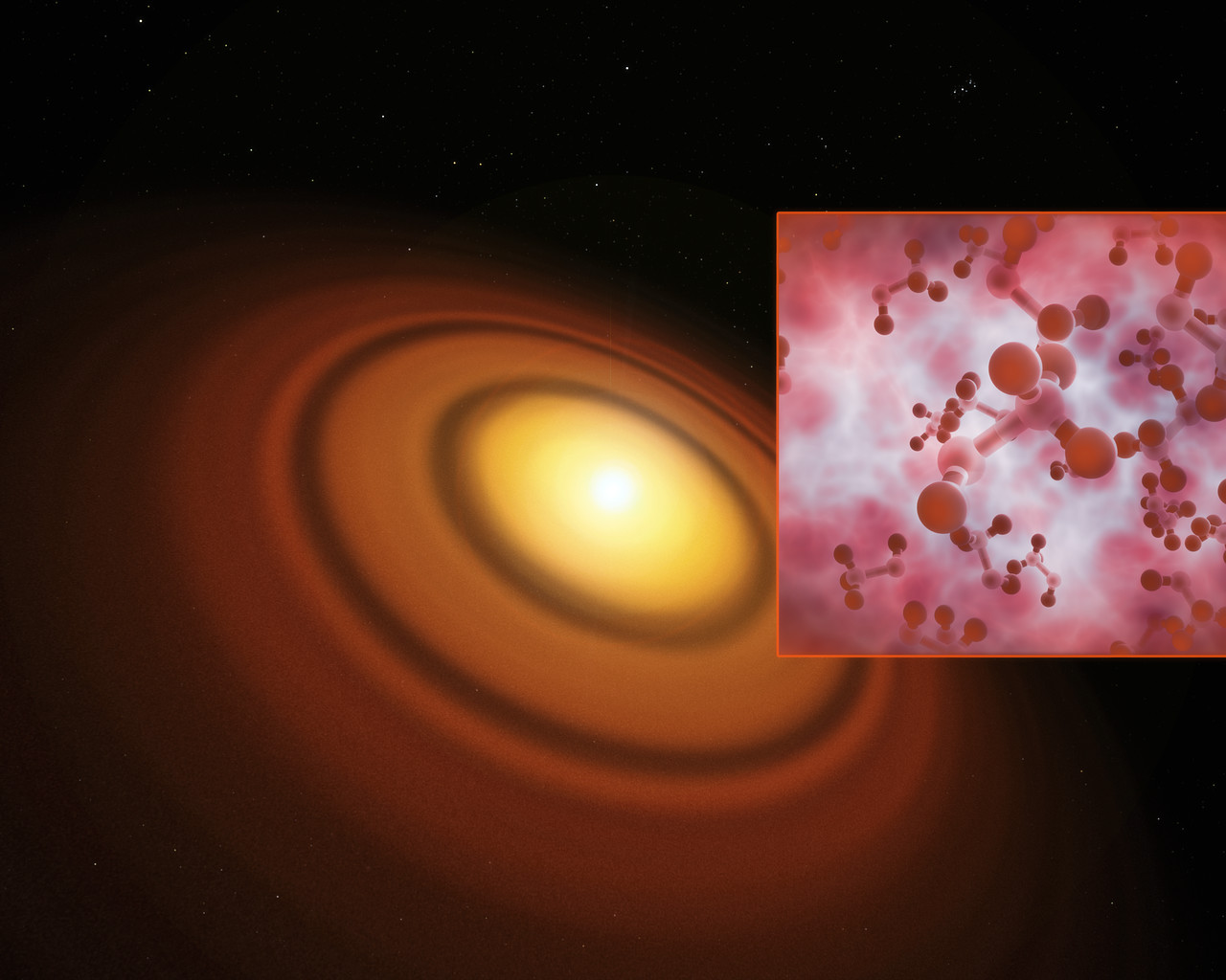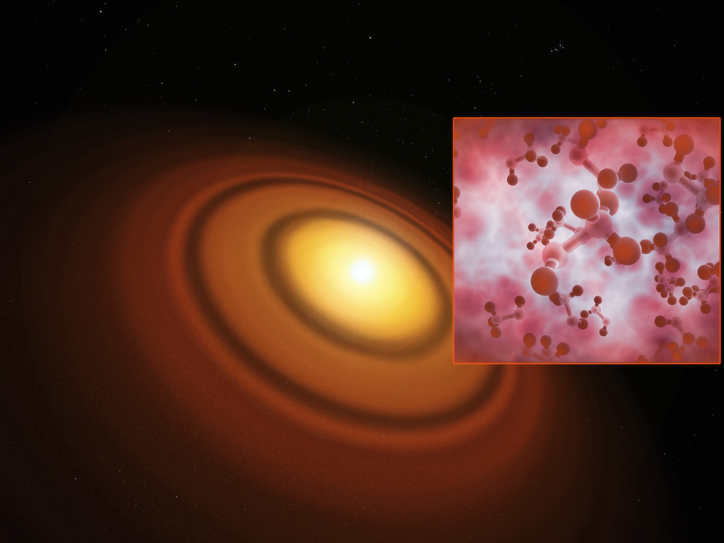 Esta impressão artística mostra o disco protoplanetário mais próximo conhecido, situado em torno da estrela TW Hydrae na enorme constelação da Hidra. O Atacama Large Millimeter/submillimeter Array (ALMA) descobriu a molécula orgânica de álcool metílico neste disco. Esta é a primeira detecção deste composto num disco jovem de formação planetária.