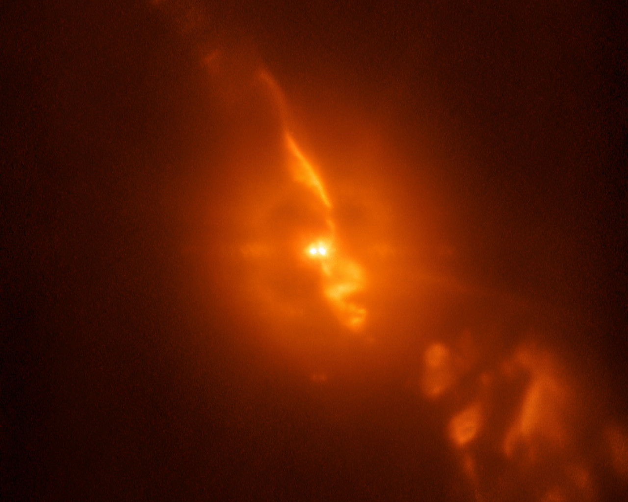 Esta imagem obtida pelo SPHERE/ZIMPOL mostra a estrela binária de R Aquarii propriamente dita juntamente com os jactos de matéria que estão a ser expelidos do duo estelar.