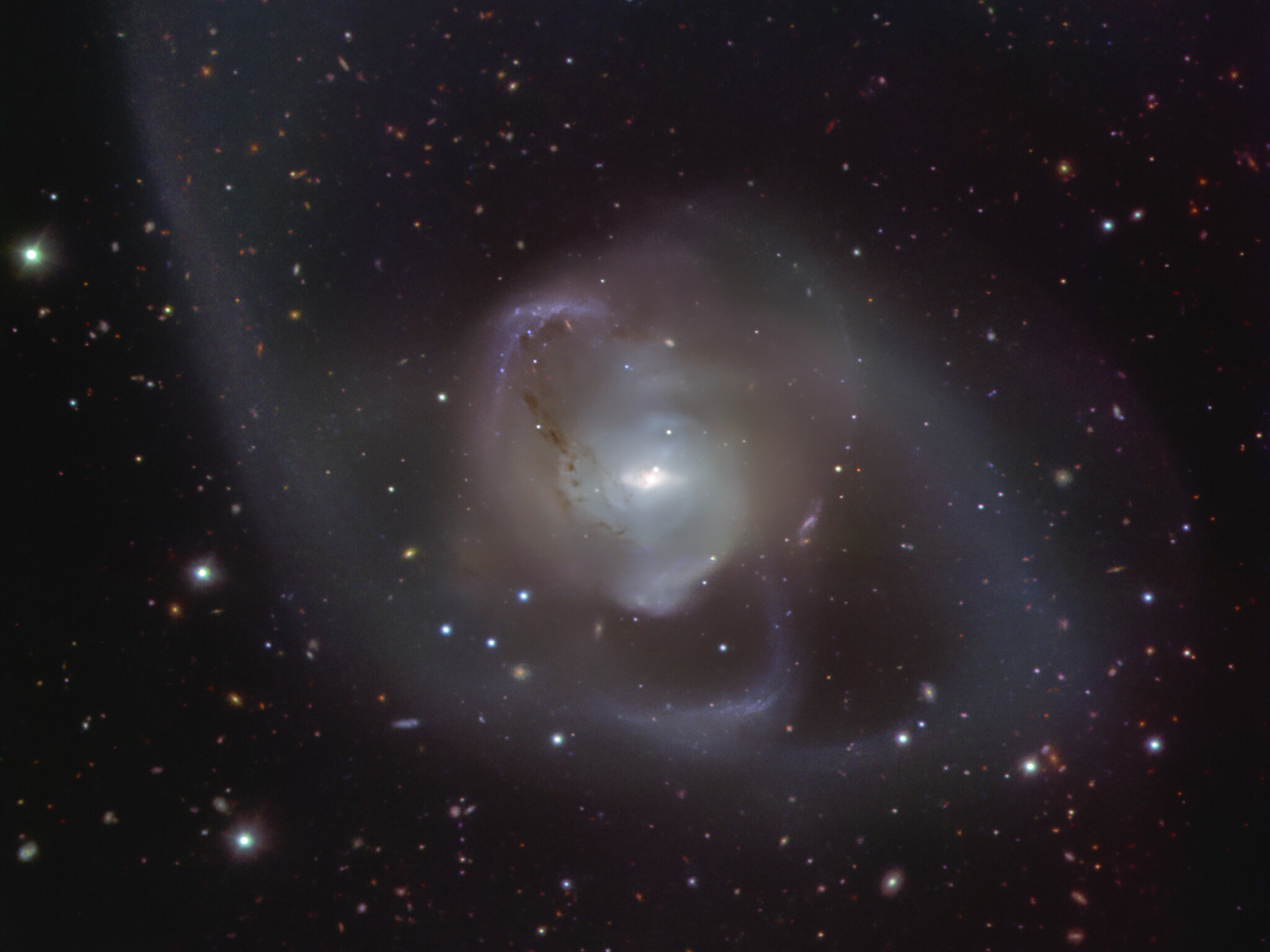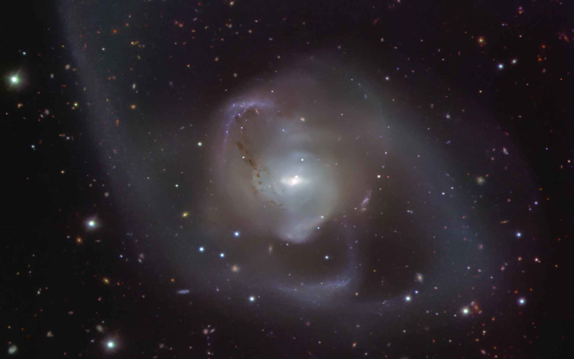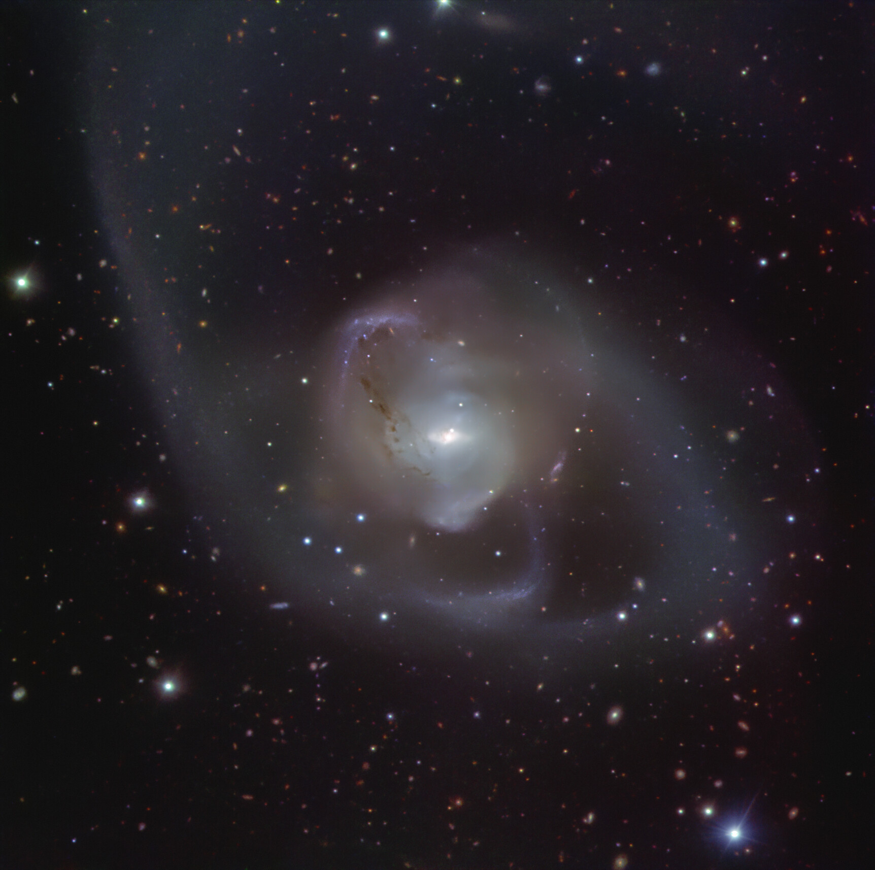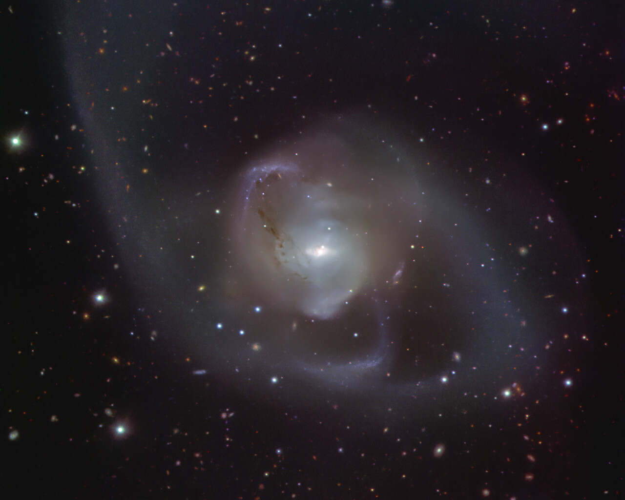 A galáxia NGC 7727 foi criada a partir da fusão de duas galáxias, processo que começou há cerca de um milhar de milhões de anos. A dança cósmica das duas galáxias dão origem à forma assimétrica e desordenada da NGC 7727. No coração da galáxia, dois buracos negros supermassivos espiralam em torno um do outro, aproximando-se cada vez mais e esperando-se que se fundam dentro de 250 milhões de anos, um piscar de olhos à escala astronómica. Esta imagem da NGC 7727 foi obtida pelo instrumento FORS2 (FOcal Reducer and low dispersion Spectrograph 2) montado no Very Large Telescope (VLT) do ESO.