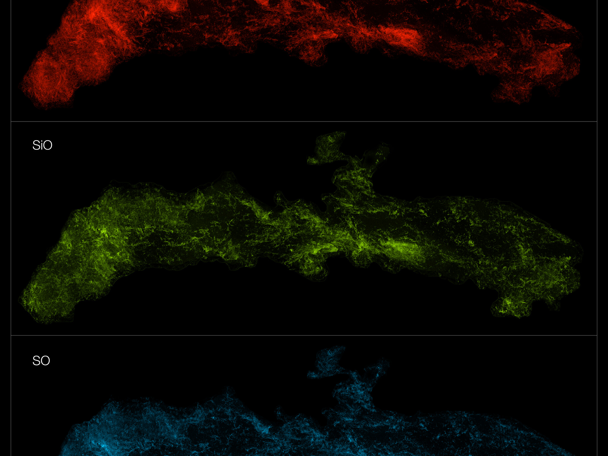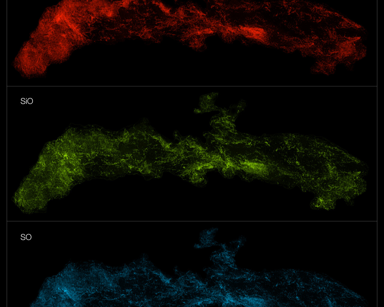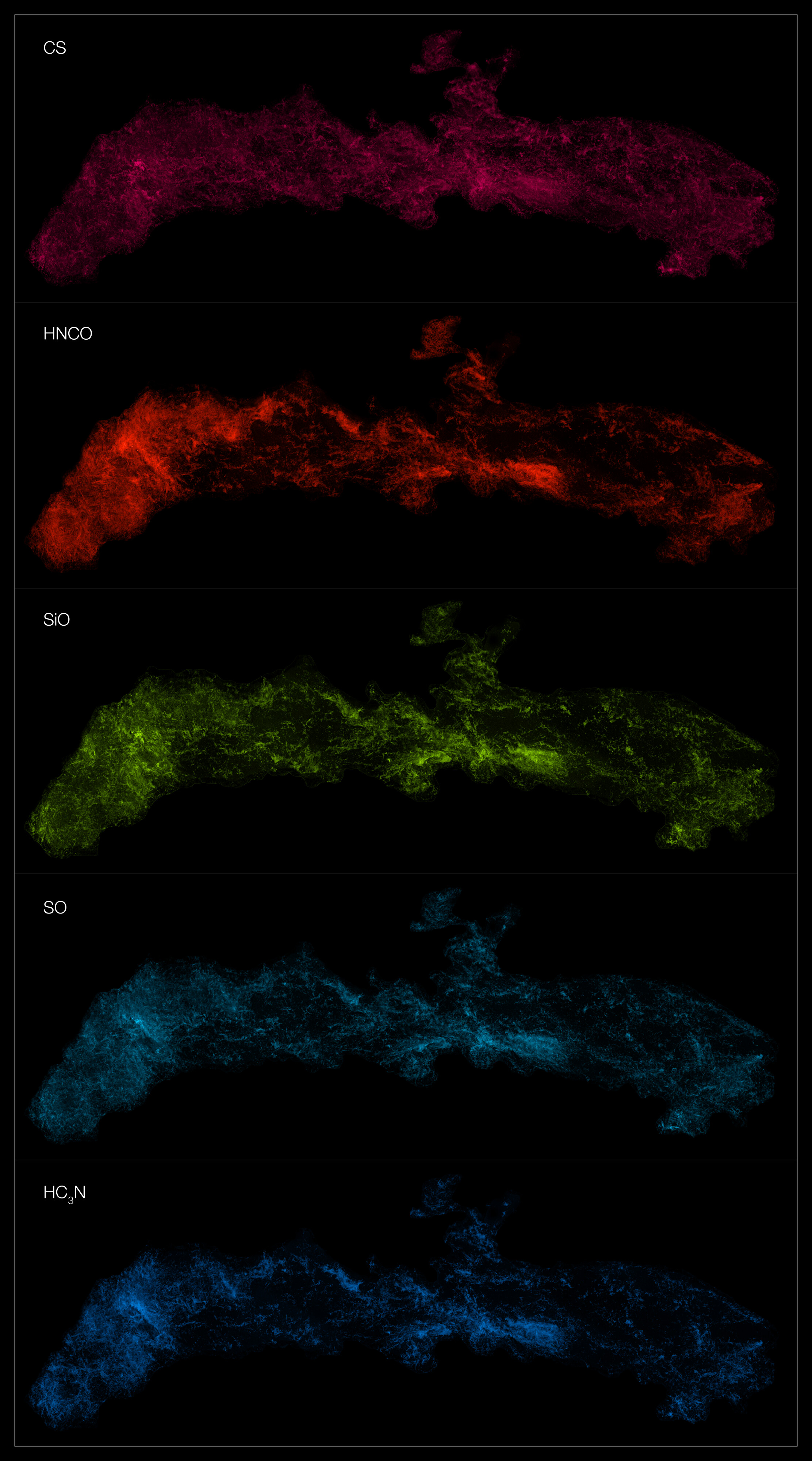 O ACES mapeou a distribuição de várias dezenas de moléculas no centro da nossa Galáxia. Aqui mostramos cinco, de cima para baixo: monossulfureto de carbono, ácido isociânico, monóxido de silício, monóxido de enxofre e cianoacetileno.