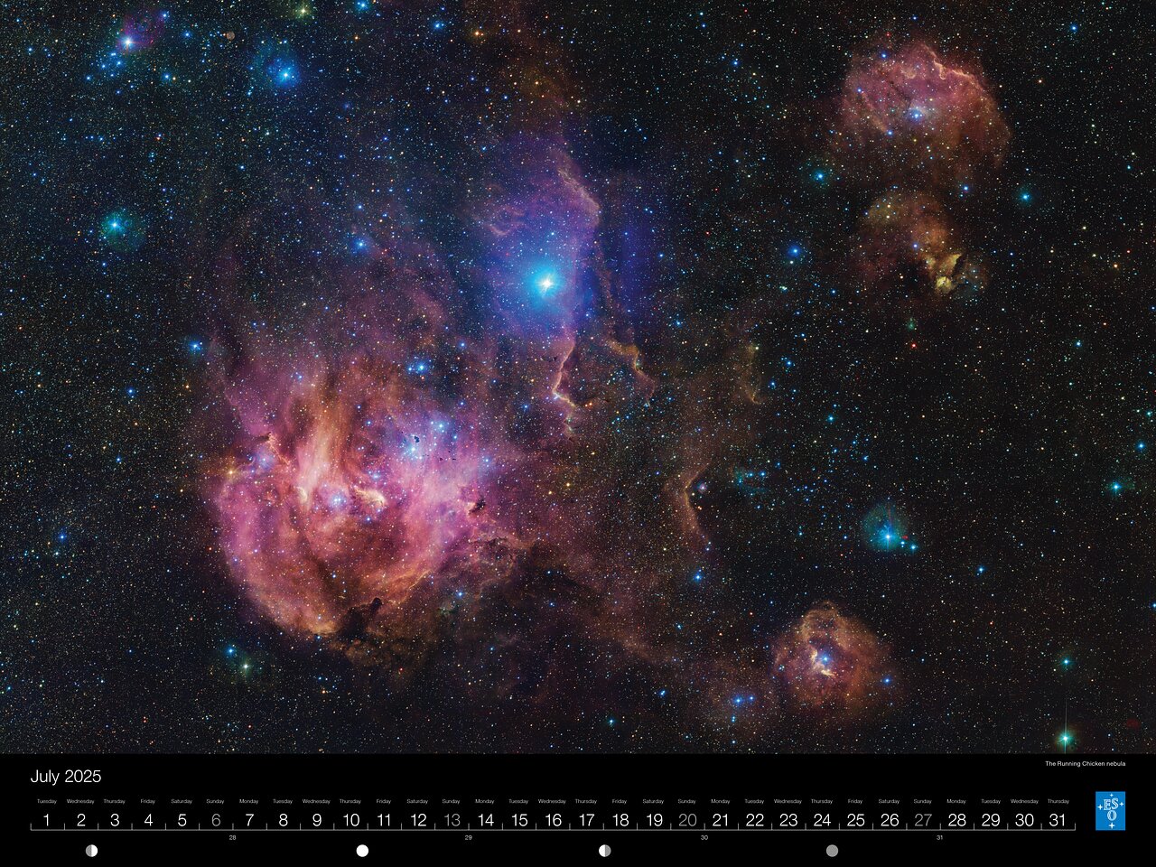The Running Chicken Nebula comprises several clouds, all of which we can see in this vast image from the VLT Survey Telescope (VST), hosted at ESO’s Paranal site. This 1.5-billion pixel image spans an area in the sky of about 25 full Moons. The clouds shown in wispy pink plumes are full of gas and dust, illuminated by the young and hot stars within them.