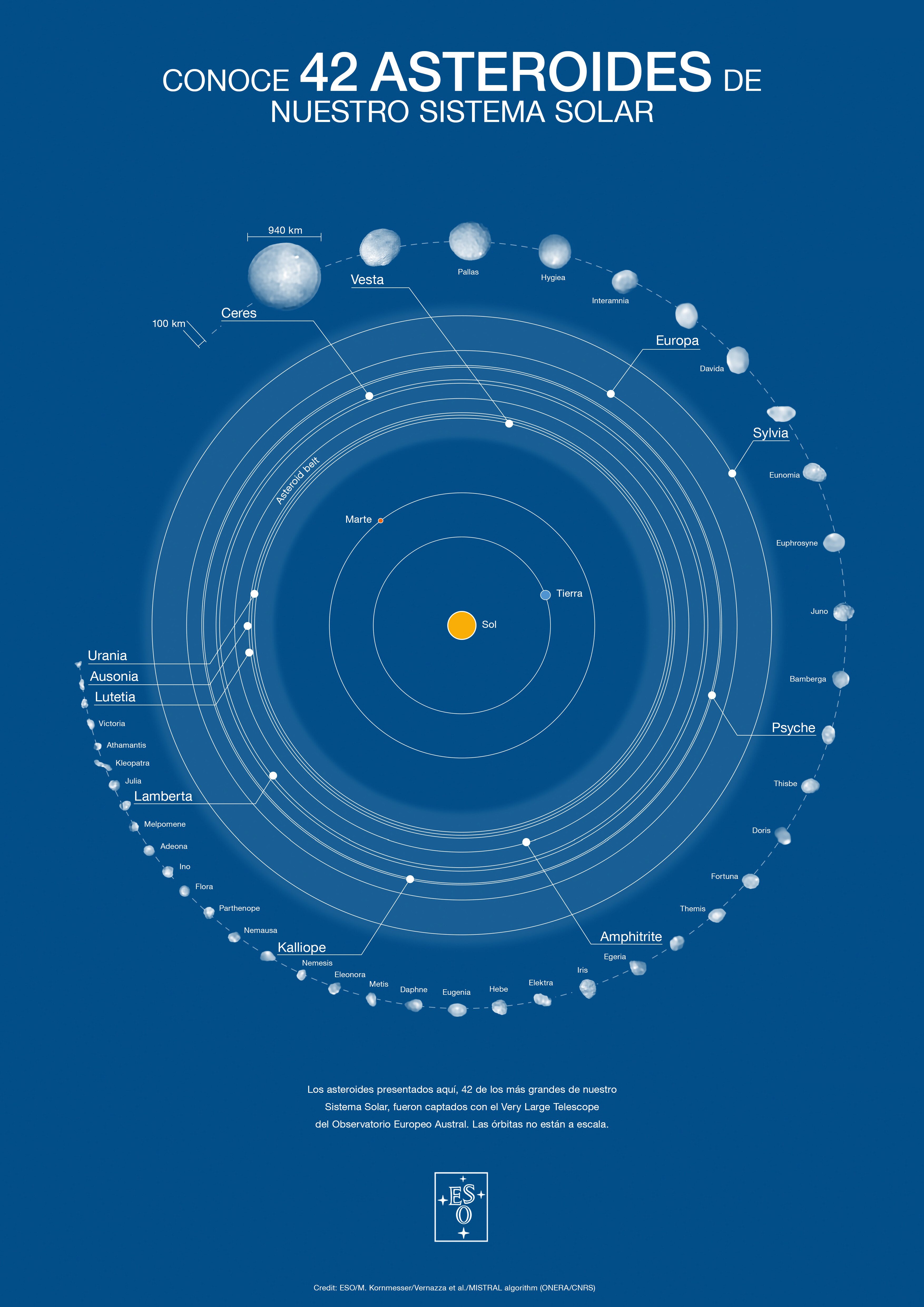 The poster shows the sharpest images ever taken of 42 of the largest asteroids between Mars and Jupiter, captured with ESO’s Very Large Telescope in Chile.