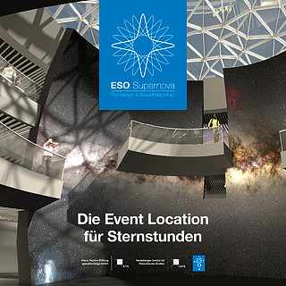 Diese Broschüre richtet sich an Veranstalter, die auf der Suche nach einem einzigartigen Veranstaltungsort sind. Die ESO Supernova bietet einen großzügigen Raum für private Veranstaltungen, ob groß oder klein, mit Platz für bis zu 600 Gäste. Je nach Bedarf können Sie das Planetarium als einzigartigen Ort für Ihre Veranstaltung nutzen, den Weltraum für Pressekonferenzen in einem modernen Umfeld, den Ausstellungsbereich für eine spannende und innovative Veranstaltung oder die Seminarräume für einen klassischeren Ansatz.
