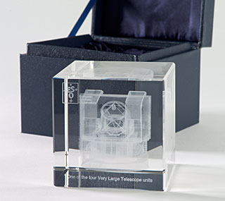 Exclusive laser engraved crystal cube showing a 3D model of the one of the four Very Large Telescope units.