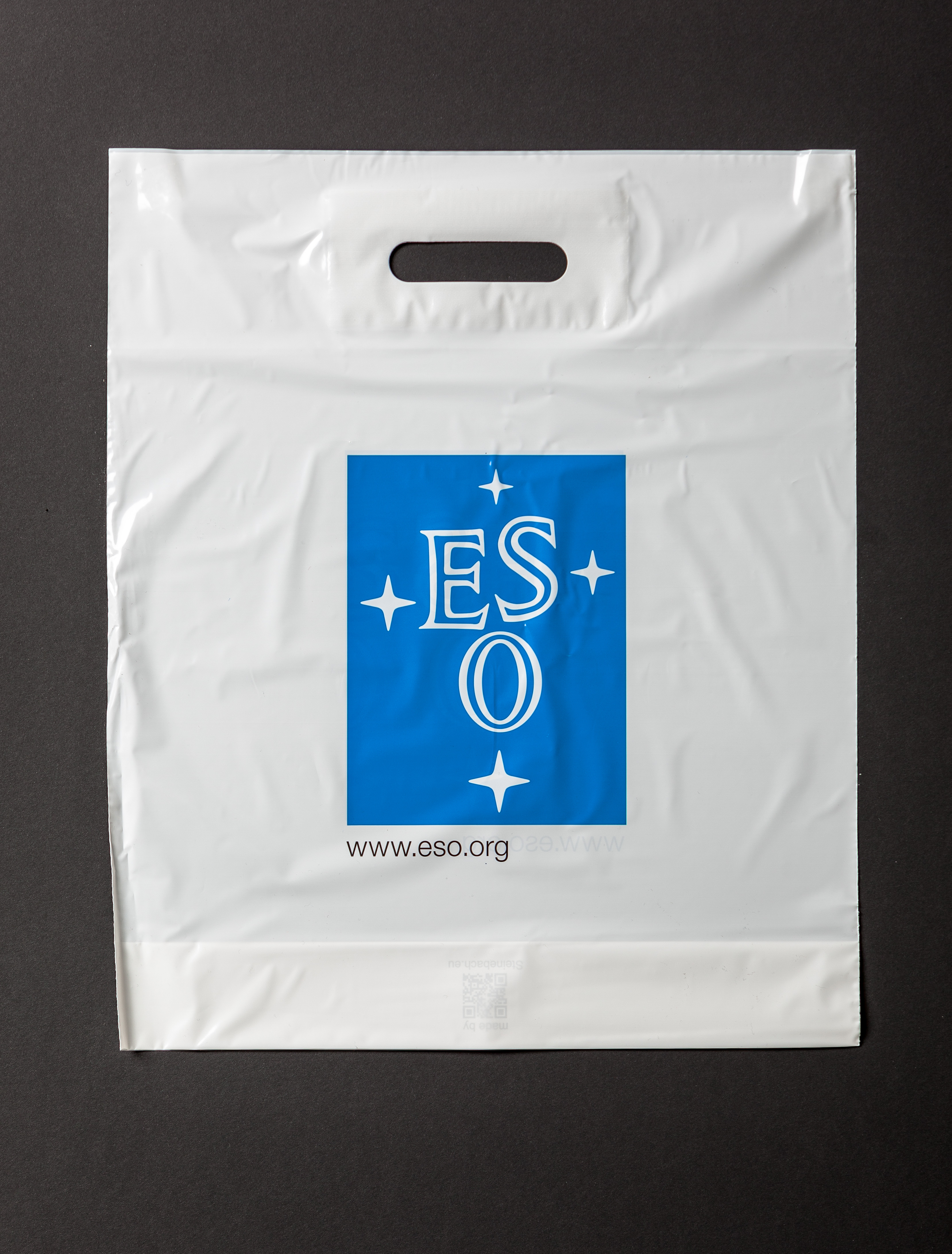 A white recyclable plastic bag featuring the official ESO logo. Dimensions: 45.2 x 37.1 cm