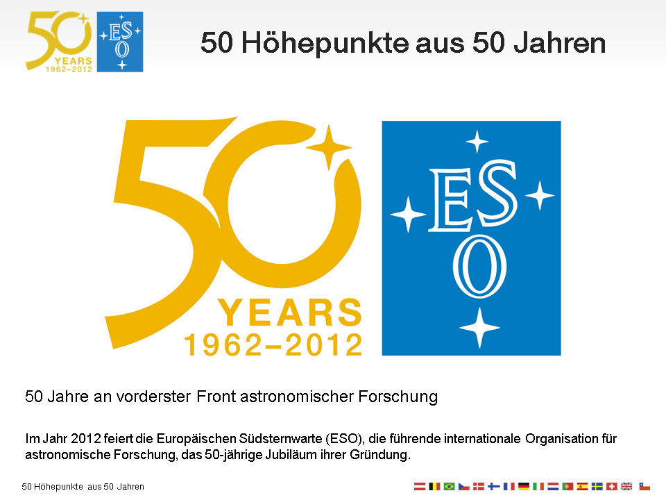 The year 2012 marks the 50th anniversary of the European Southern Observatory (ESO), the foremost intergovernmental astronomy organisation in the world. This presentation shows 50 selected highlights from the first 50 years of ESO's history.