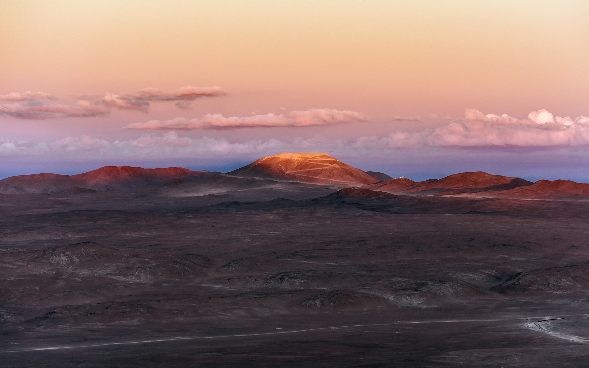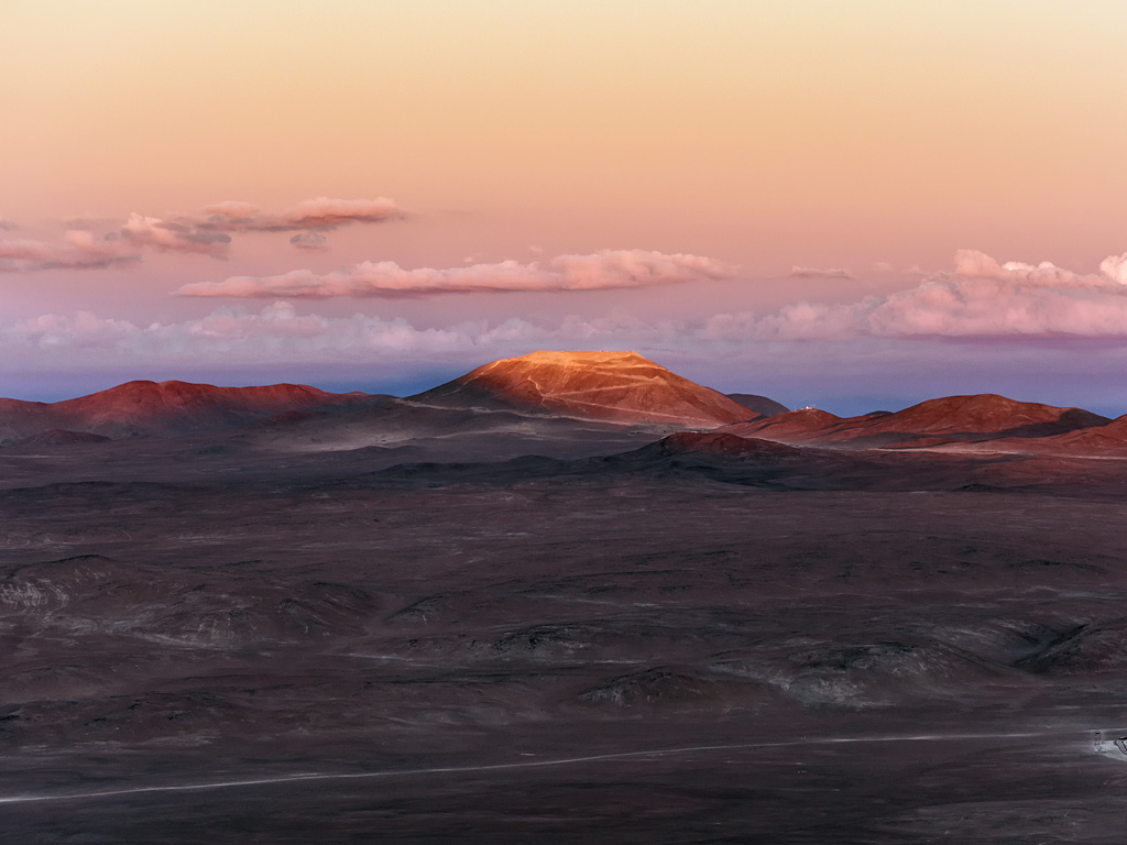 Panorámica de colores ceniza y marrón de Atacama, tomada hacia el interior desde el Océano Pacífico. La majestuosa cumbre de Cerro Armazones y su ladera grabada de curvas del camino de acceso, es uno de los pocos puntos que se aferran a la luz del sol que se desvanece.