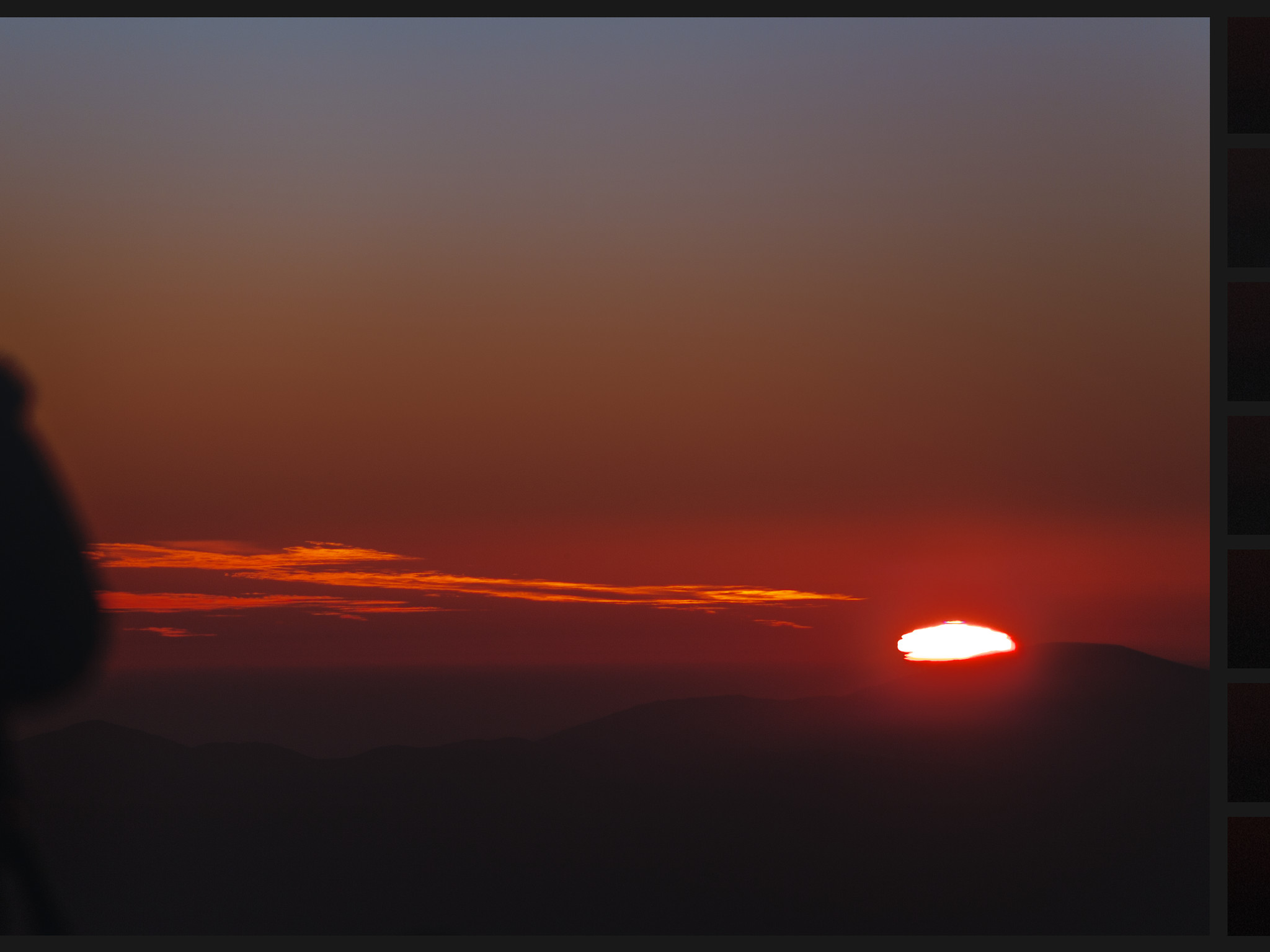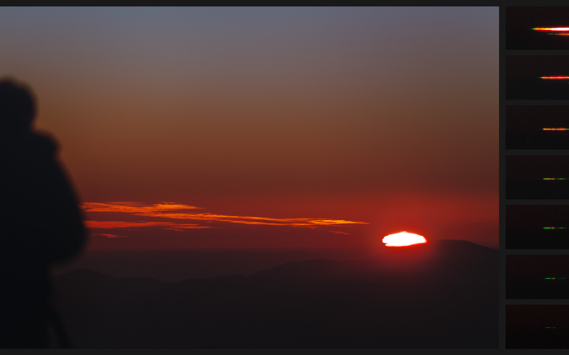 This image of a sunset at La Silla shows the phenomenon of green flash. This effect can occur when the Sun is close to the horizon and the atmosphere separates its light into different colours. On the right side of the image are 7 zoomed shots of the top edge of the disk, taken at the last few moments before complete sunset. On the left side is the silhouette of ESO Photo Ambassador Yuri Beletsky.