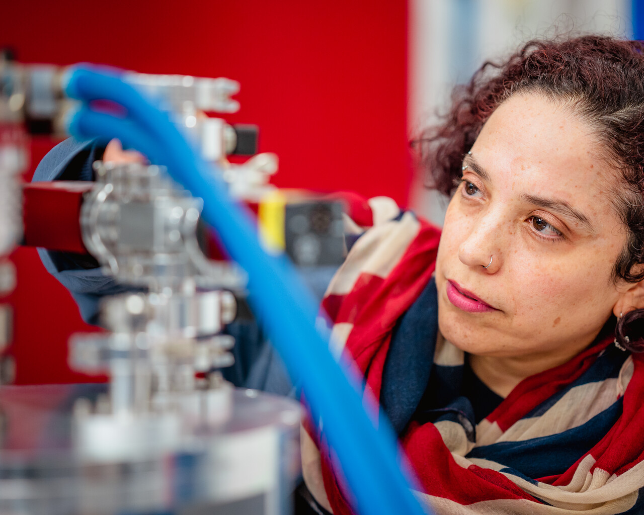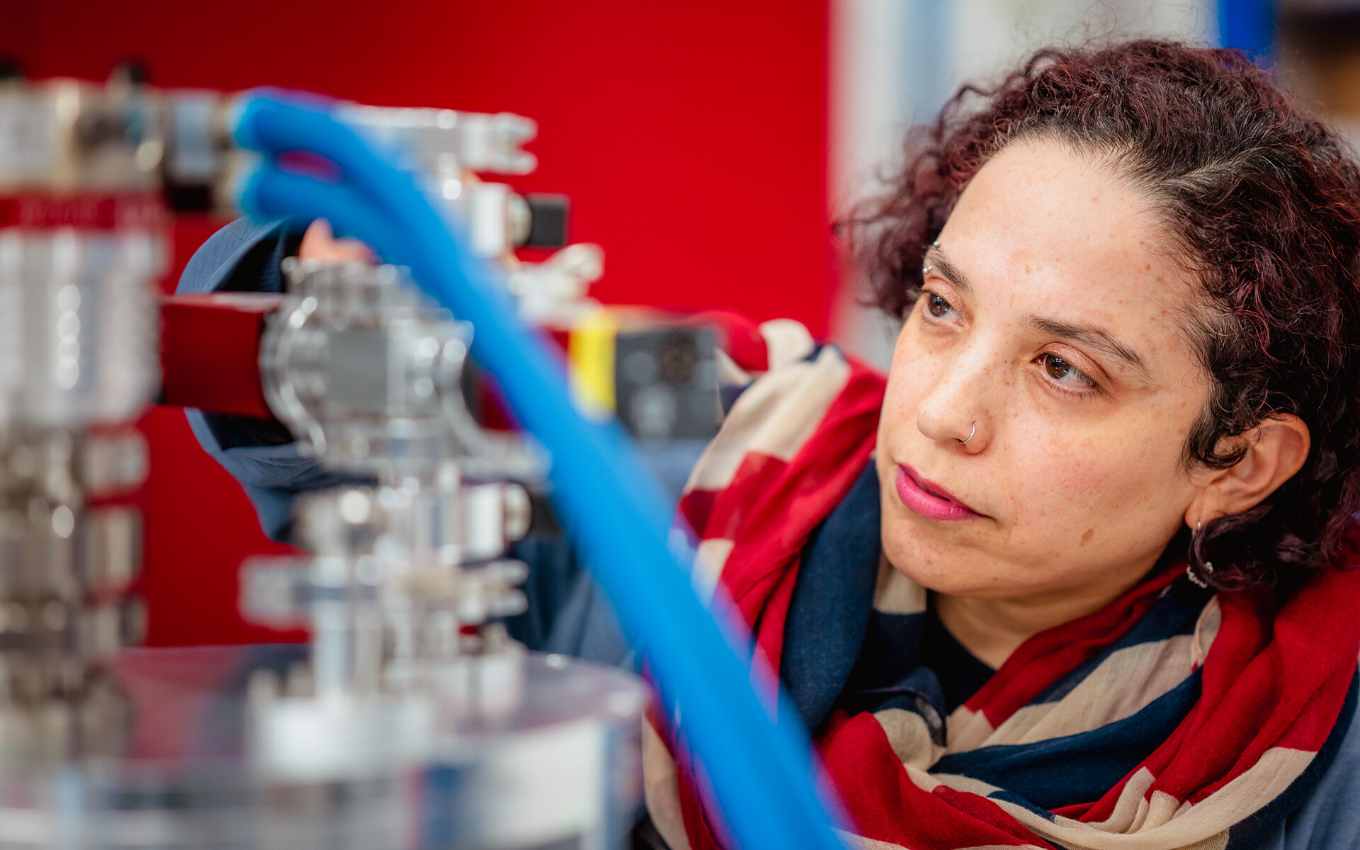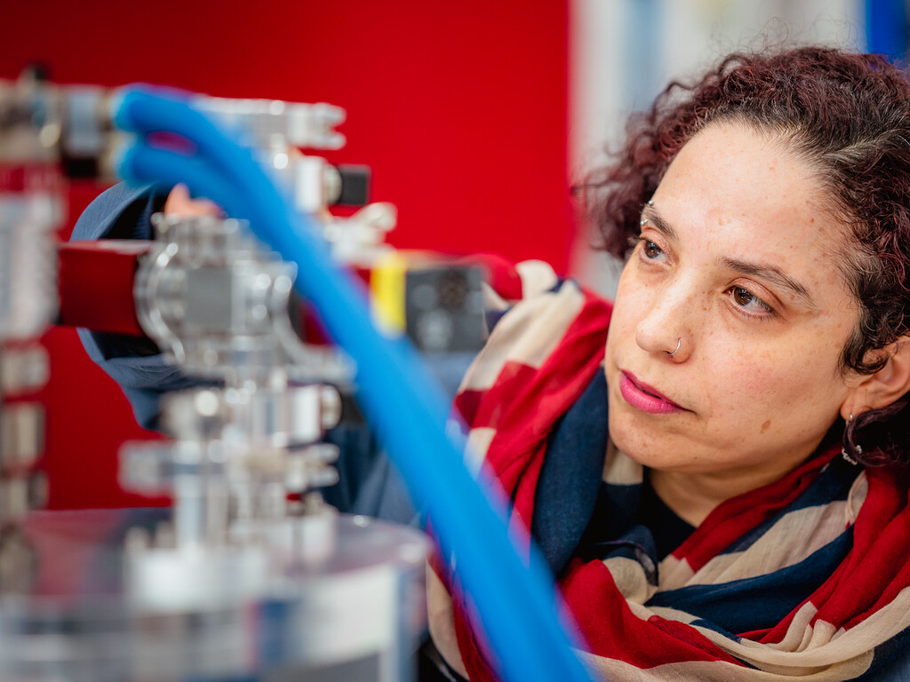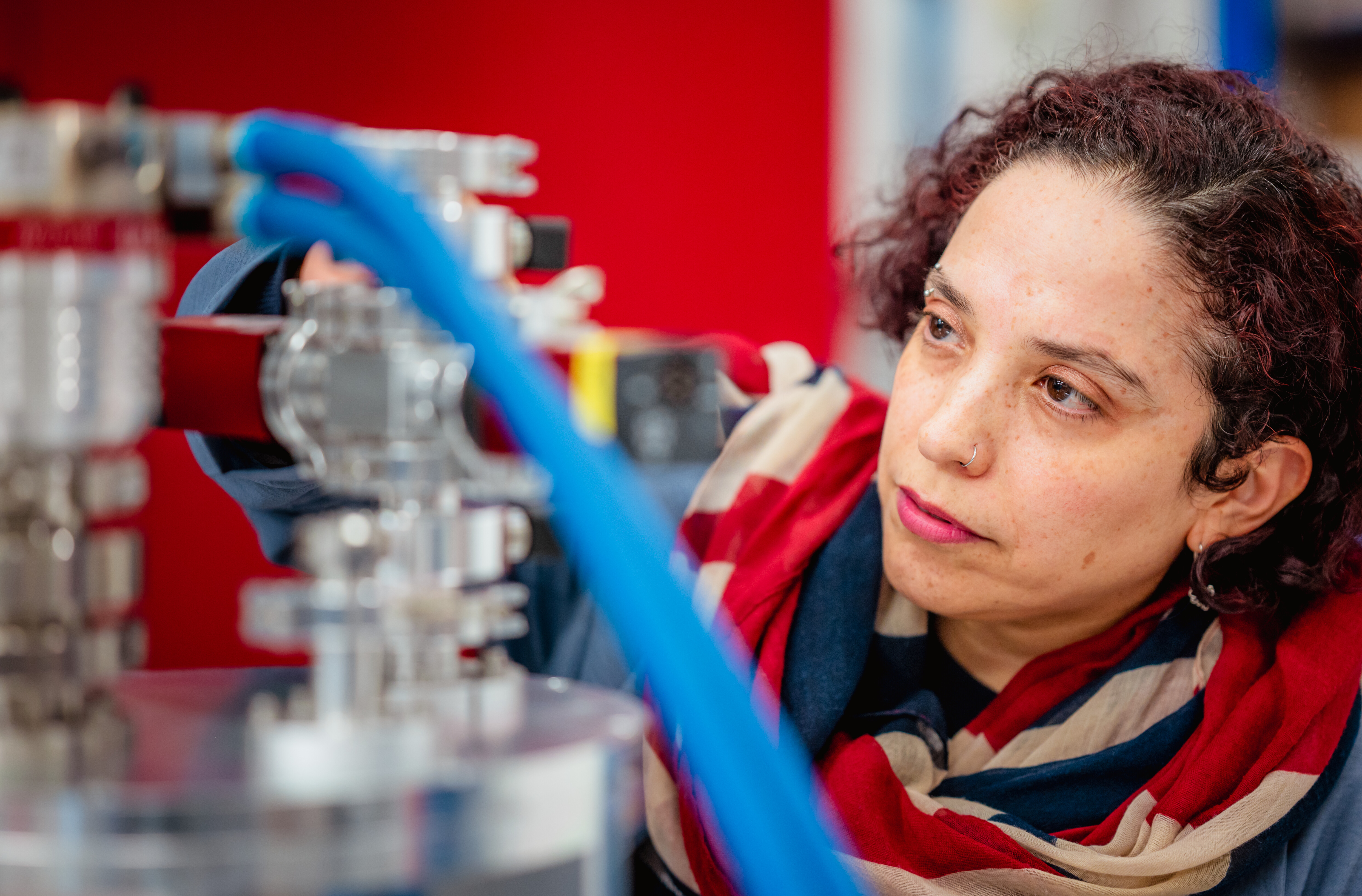 Angela Cortes examines a sensor at the Phasing and Diagnostic Station