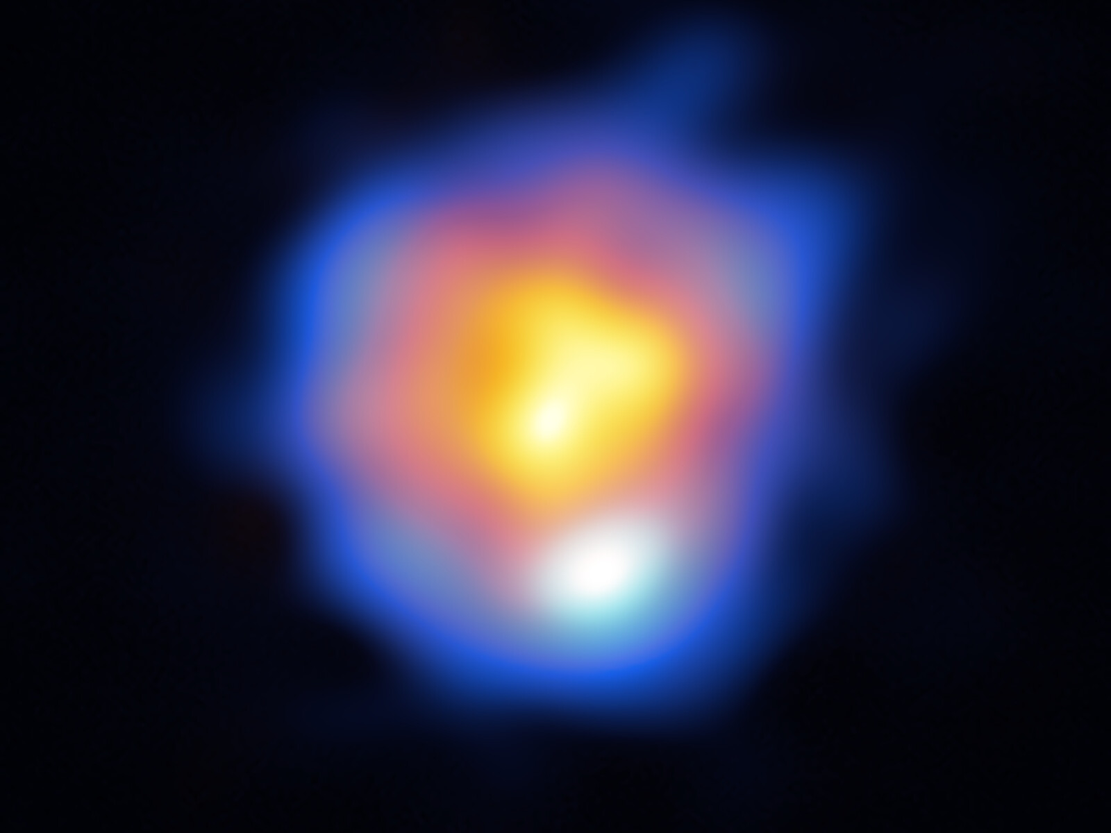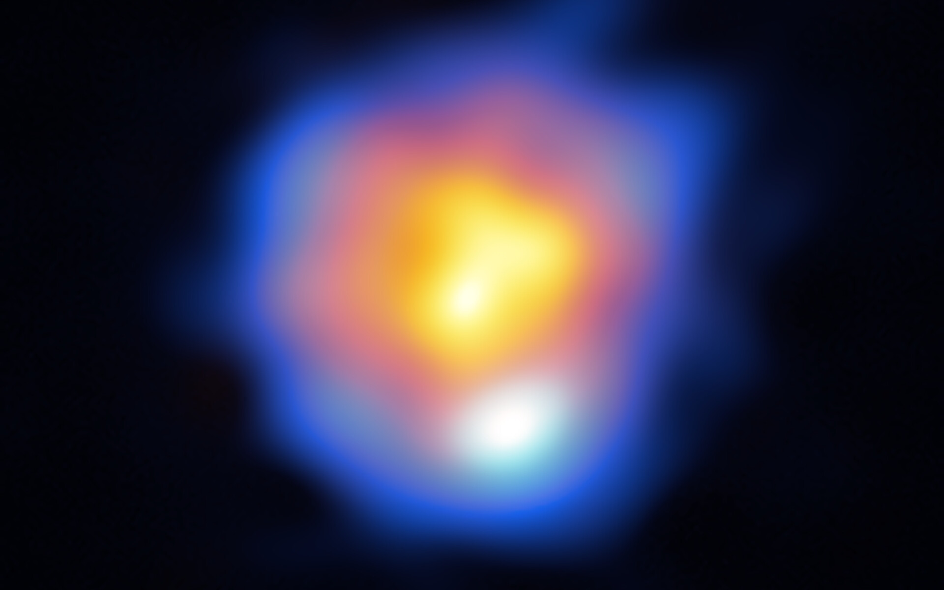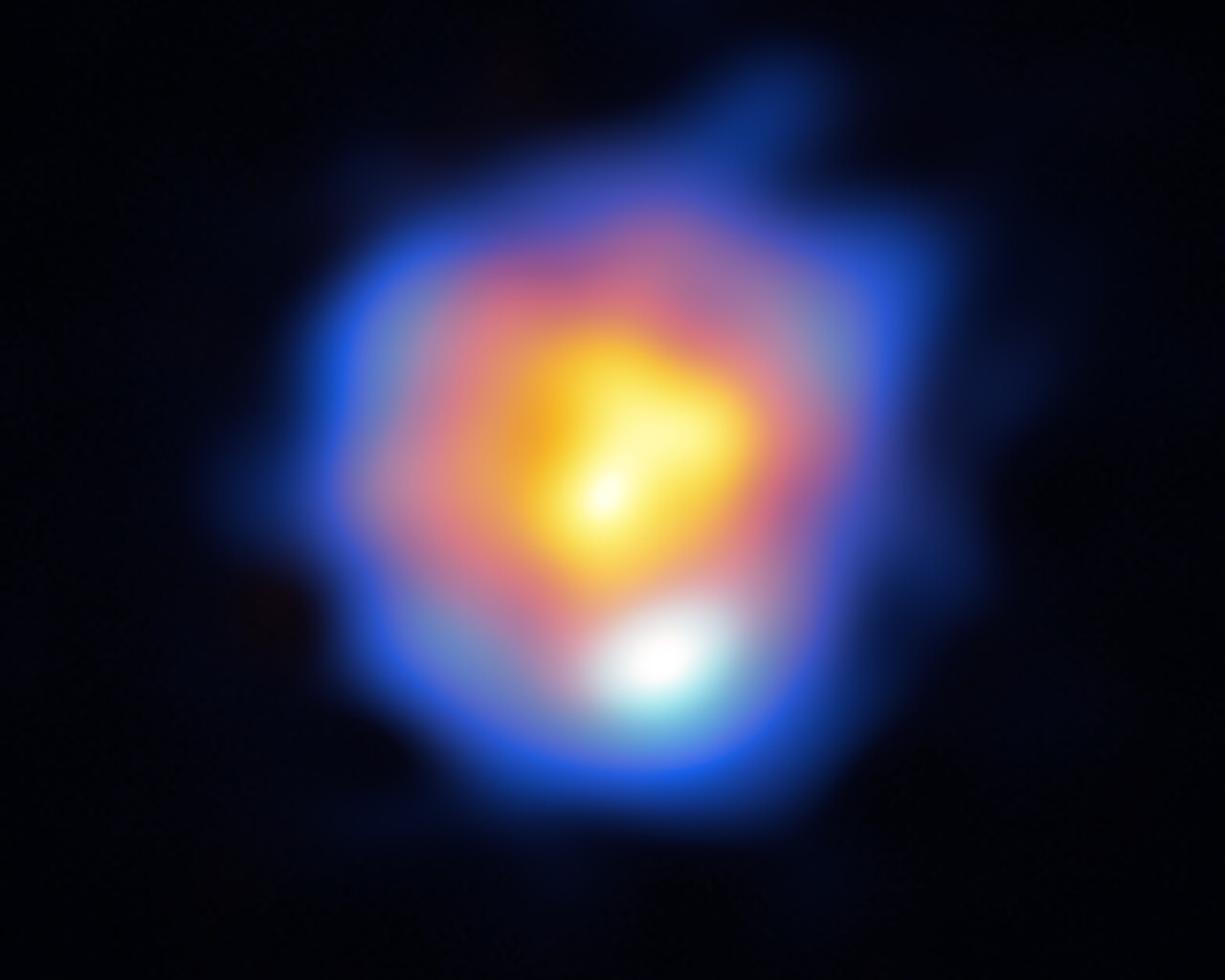 Esta imagen de R Leporis, una estrella en las etapas finales de su evolución, es la de mayor resolución jamás lograda con ALMA. Tiene una resolución angular de 5 milisegundos de arco, equivalente a ver un autobús de 10 metros de largo en la Luna. Esto se logró utilizando los receptores de Banda 10 (alta frecuencia) de ALMA y configurando el conjunto con una longitud de línea de base máxima de 16 kilómetros, además del empleo de una novedosa técnica de calibración. En naranja, se observa la emisión de ondas submilimétricas de la superficie estelar y, en azul, las emisiones máser de cianuro de hidrógeno de 891 GHz. Las observaciones muestran que la estrella está rodeada por una estructura de gas en forma de anillo y que el gas de la estrella escapa al espacio circundante.