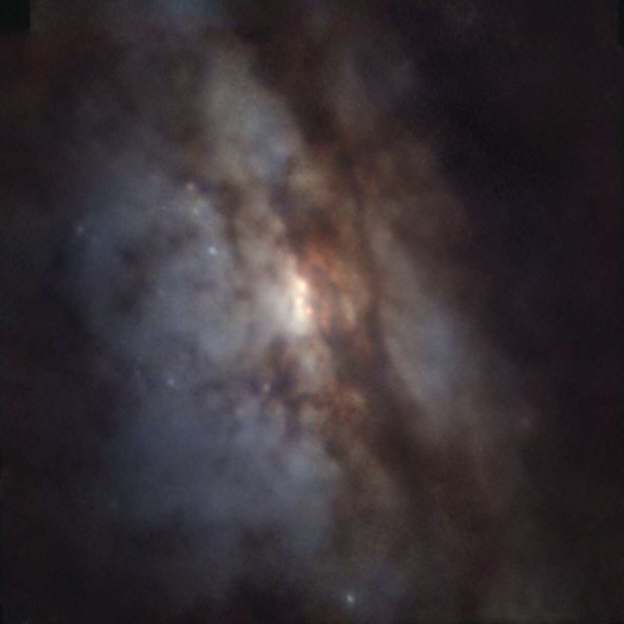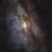 Las dos imágenes que se muestran fueron tomadas utilizando datos del instrumento MUSE, instalado en el VLT de ESO, en Chile. La imagen de la izquierda muestra una vista clásica de esta galaxia, con caminos de polvo que oscurecen la luz de las estrellas. La imagen de la derecha muestra la emisión de oxígeno, nitrógeno e hidrógeno en azul, verde y rojo, respectivamente. El rojo indica áreas de formación estelar y la región central blanca brillante indica la presencia de dos agujeros negros supermasivos que tragan material de su entorno.