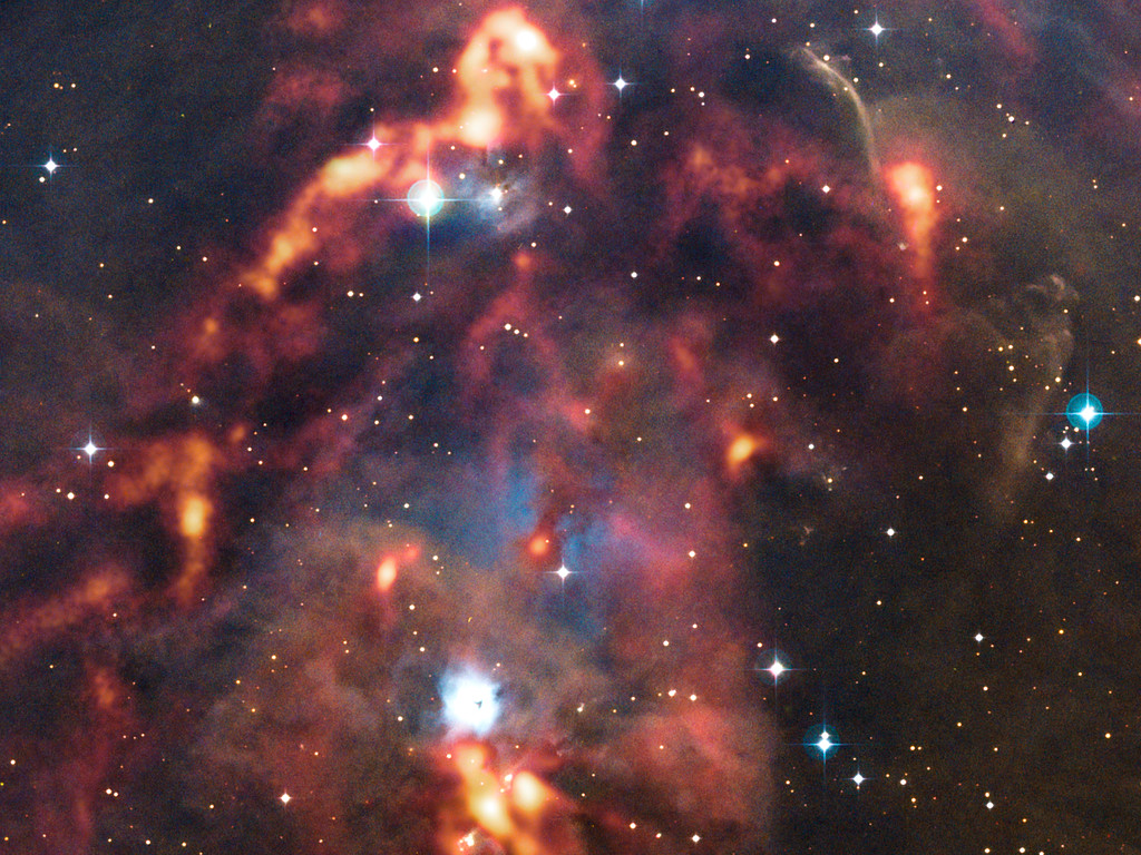 Una nueva imagen del telescopio APEX (Atacama Pathfinder Experiment) en Chile, nos permite contemplar las hermosas nubes de polvo cósmico en la región de Orión. Mientras que estas densas nubes interestelares parecen oscuras en las observaciones realizadas en luz visible, la cámara LABOCA, instalada en el telescopio APEX, puede detectar el resplandor de calor que emana del polvo, revelando los lugares ocultos en los que se están formando nuevas estrellas.La imagen muestra la región que rodea a la nebulosa de reflexión NGC 1999 en luz visible, con las observaciones de APEX superpuestas en brillantes tonos anaranjados que parecen incendiar las nubes oscuras.