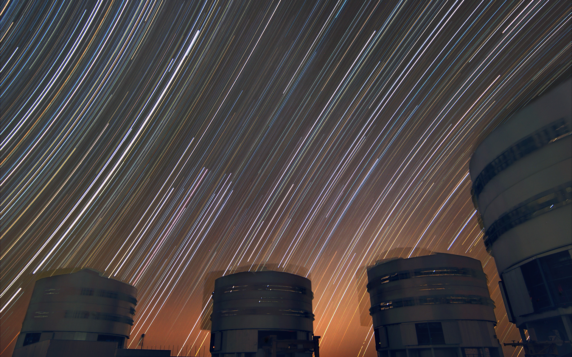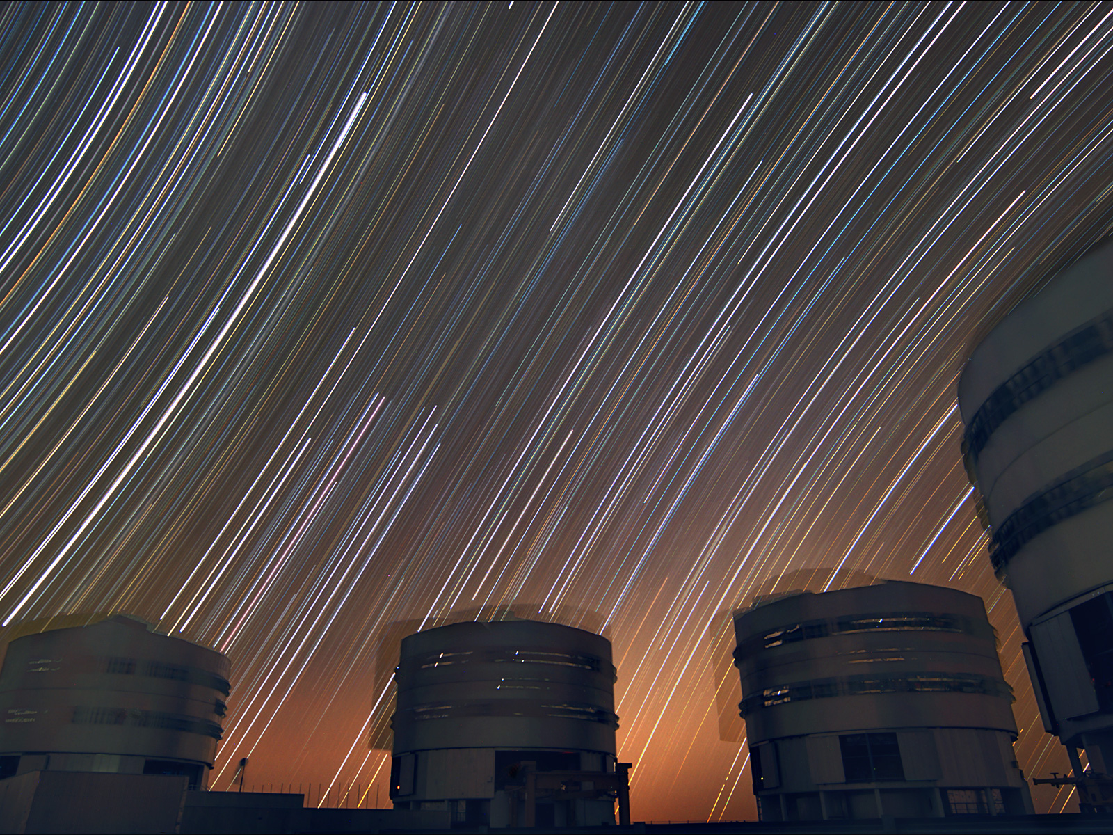 El cielo rotante sobre el VLT (Very Large Telescope) de ESO, en Paranal. Esta larga exposición muestra a las estrellas rotando alrededor del polo sur (izquierda) y el polo norte (derecha) celestes, situándose el ecuador celeste en el centro de la imagen -donde parece que las estrellas se mueven en línea recta-. También es visible el movimiento de la cúpula del VLT.