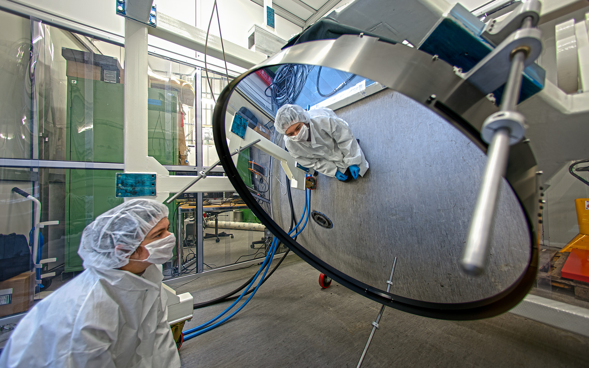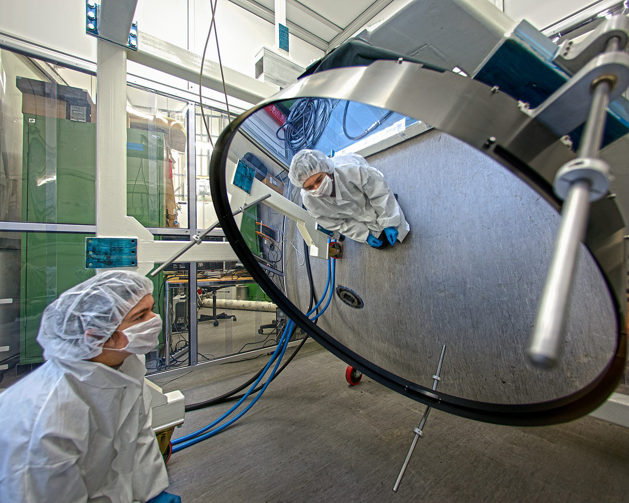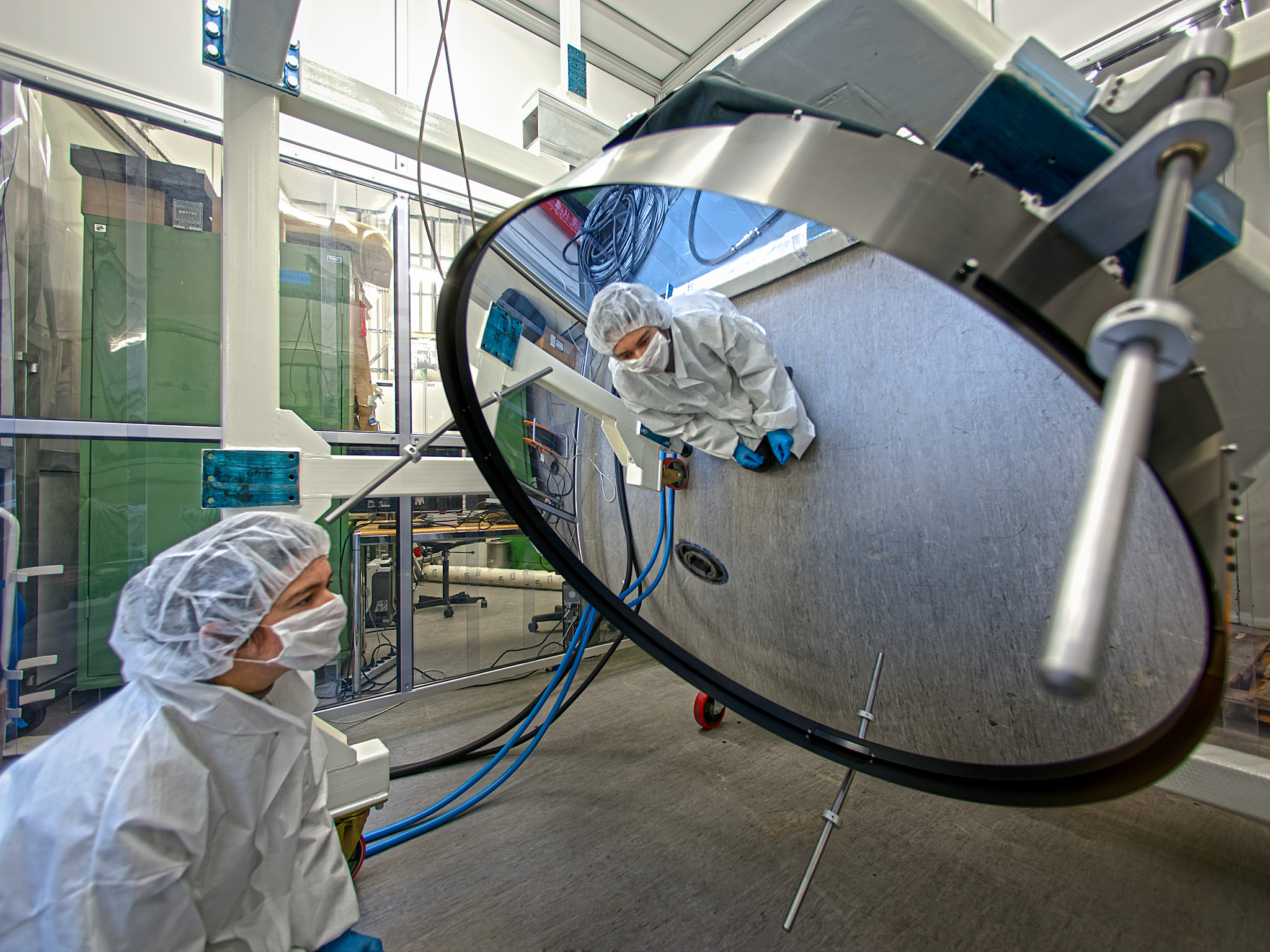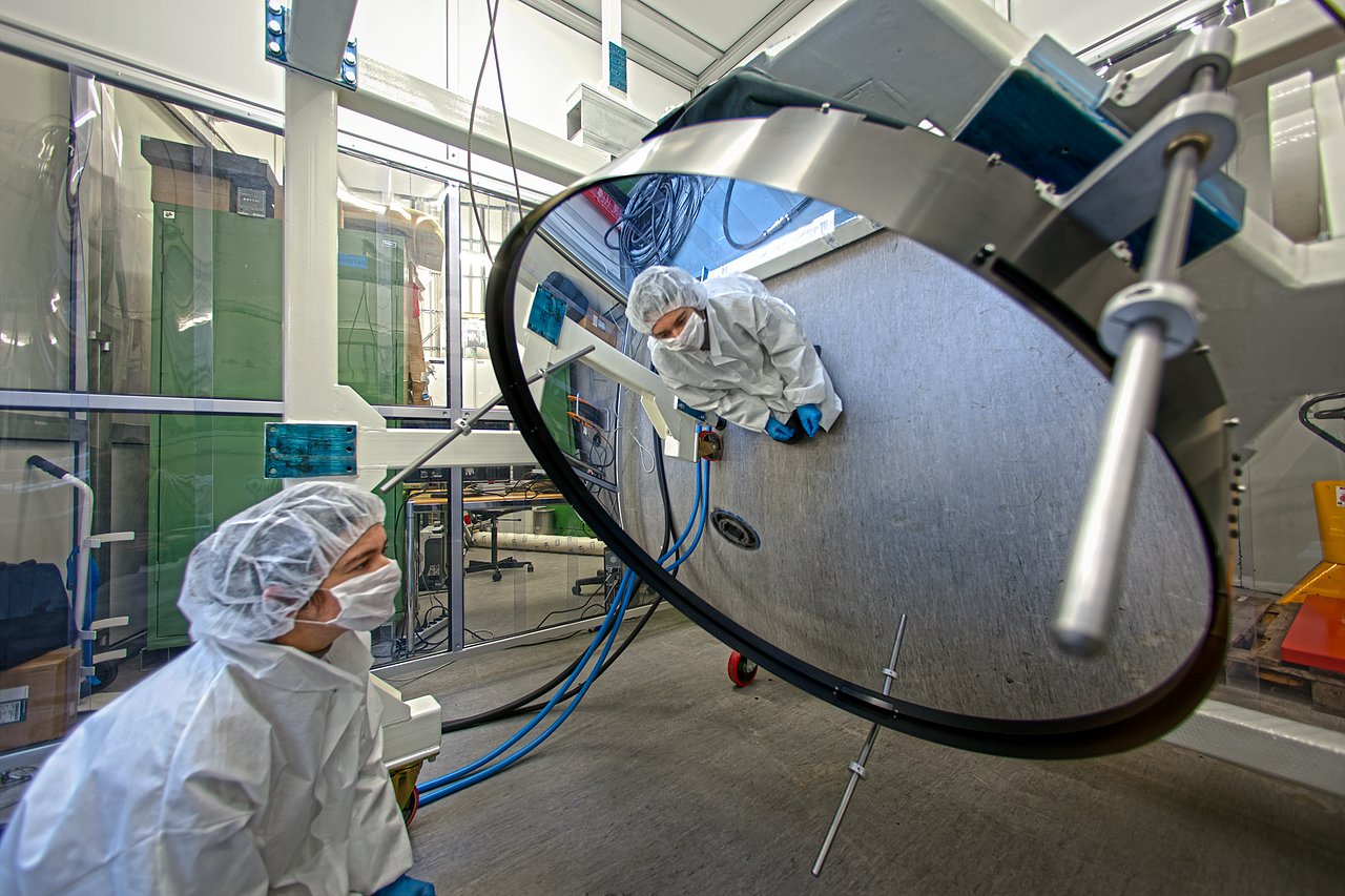Este impresionante espejo delgado deformable ha sido entregado a ESO en Garching, Alemania, y en la foto se muestra pasando una de sus pruebas. Tiene un tamaño de 1.120 milímetros, pero solo 2 milímetros de grosor, lo que hace que sea mucho más delgado que la mayor parte de las ventanas de vidrio. El espejo es muy fino, de manera que es lo suficientemente flexible como para que las fuerzas magnéticas aplicadas alteren la forma de su superficie reflectora. Cuando se instale, la superficie del espejo cambiará constantemente por pequeñas cantidades de estas fuerzas que corregirán los efectos de deformación de la atmósfera de la Tierra, generando así imágenes mucho más precisas.