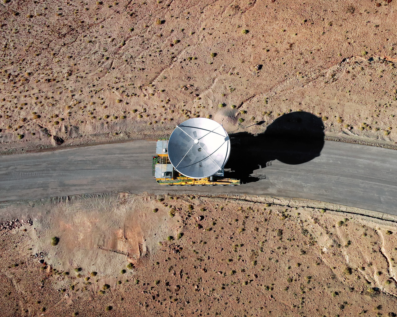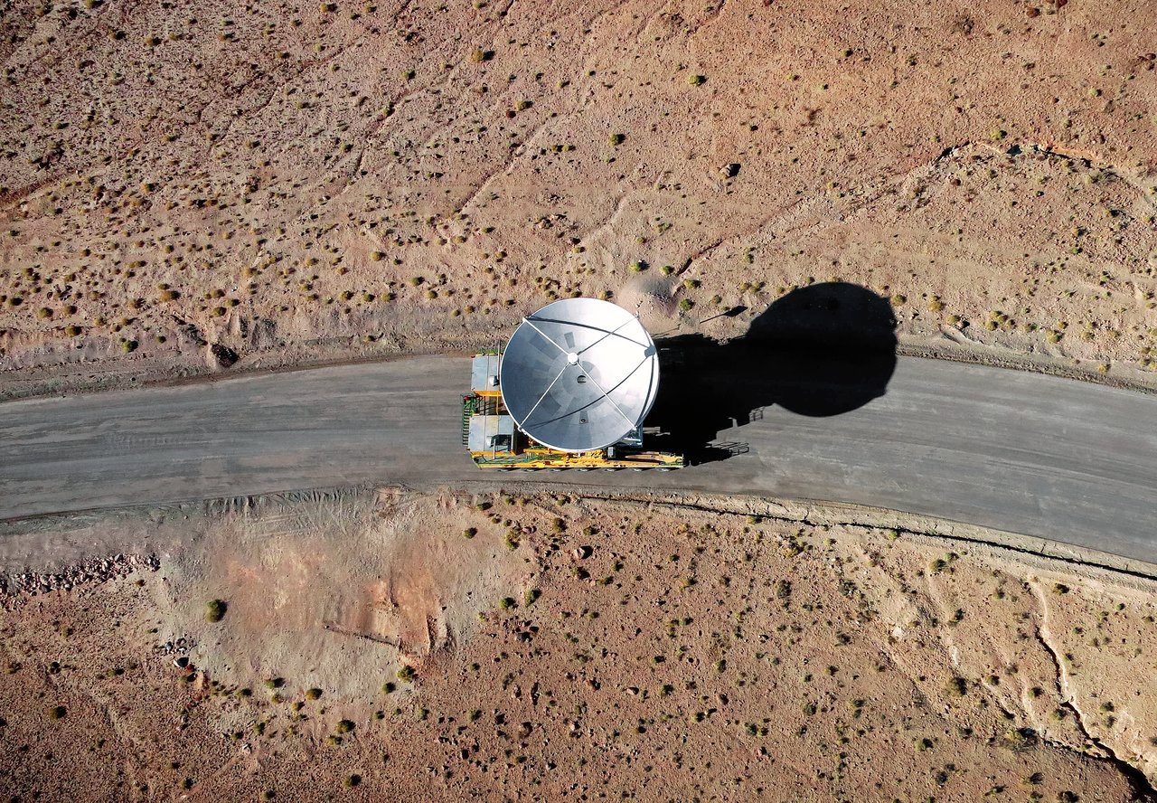 One of ALMA's giant antennas is moved around the Chajnantor Plateau in Chile, the 3000-metre altitude location of the 66-dish array. The dishes are all either 12 or 7 metres in diameter and weigh around 100 tonnes. Two custom-built vehicles known as the ALMA transporters can pick up the dishes, move and reposition them with millimetric precision. This ability to rearrange the receivers gives the whole array a powerful "zoom" feature.