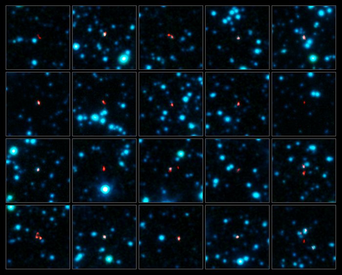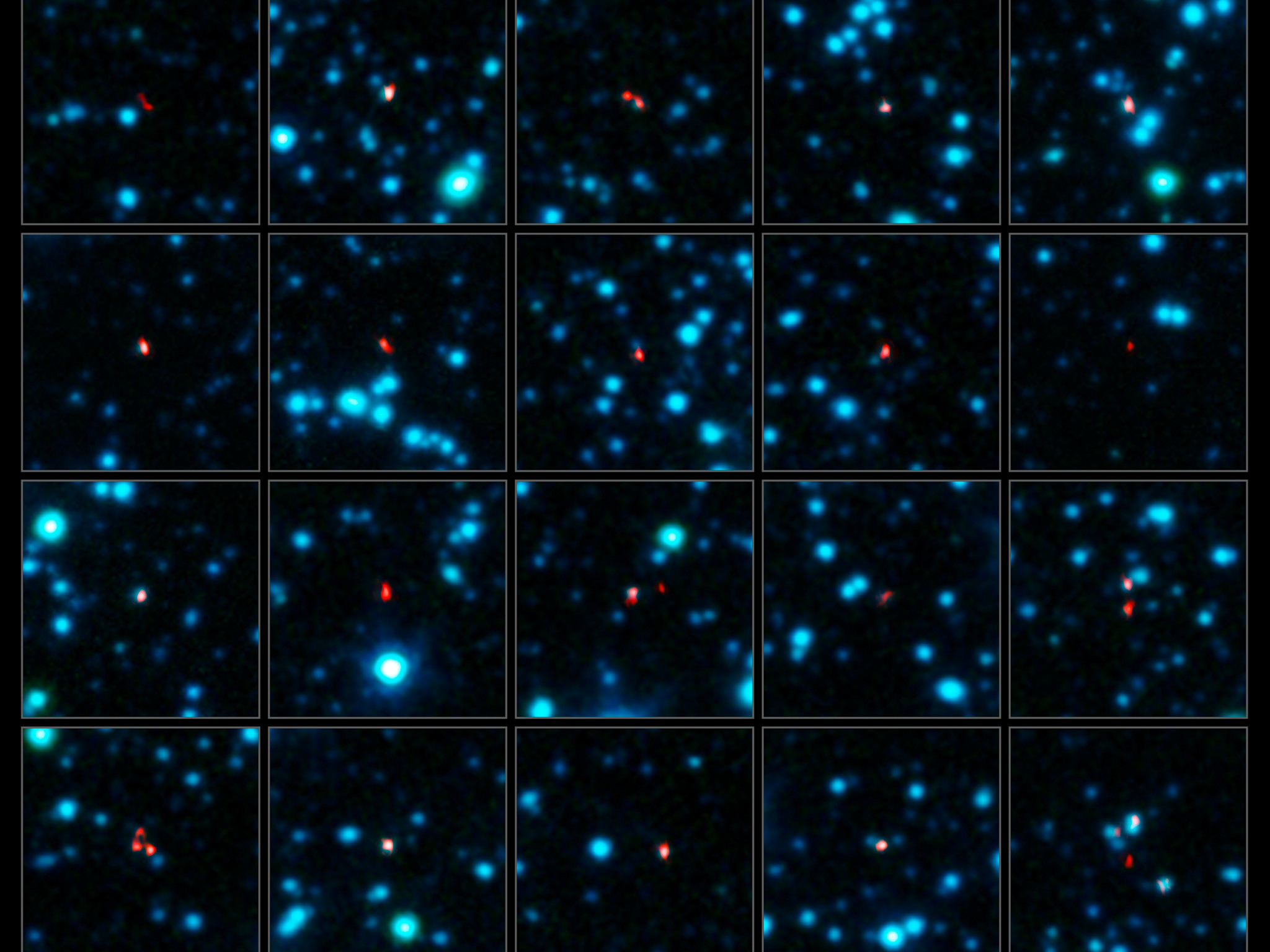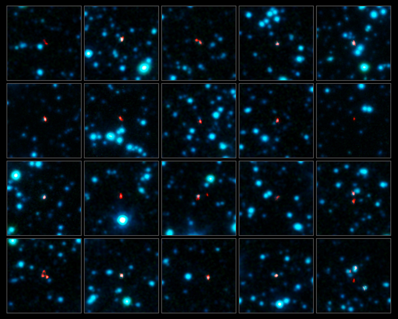 I den här bilden ser vi ett närbilder på ett urval av dessa galaxer. ALMA:s observationer, vid submillimetervåglängder, visas i rött ovanpå en infraröd bild av området tagen med kameran IRAC på Spitzerteleskopet (i blått).