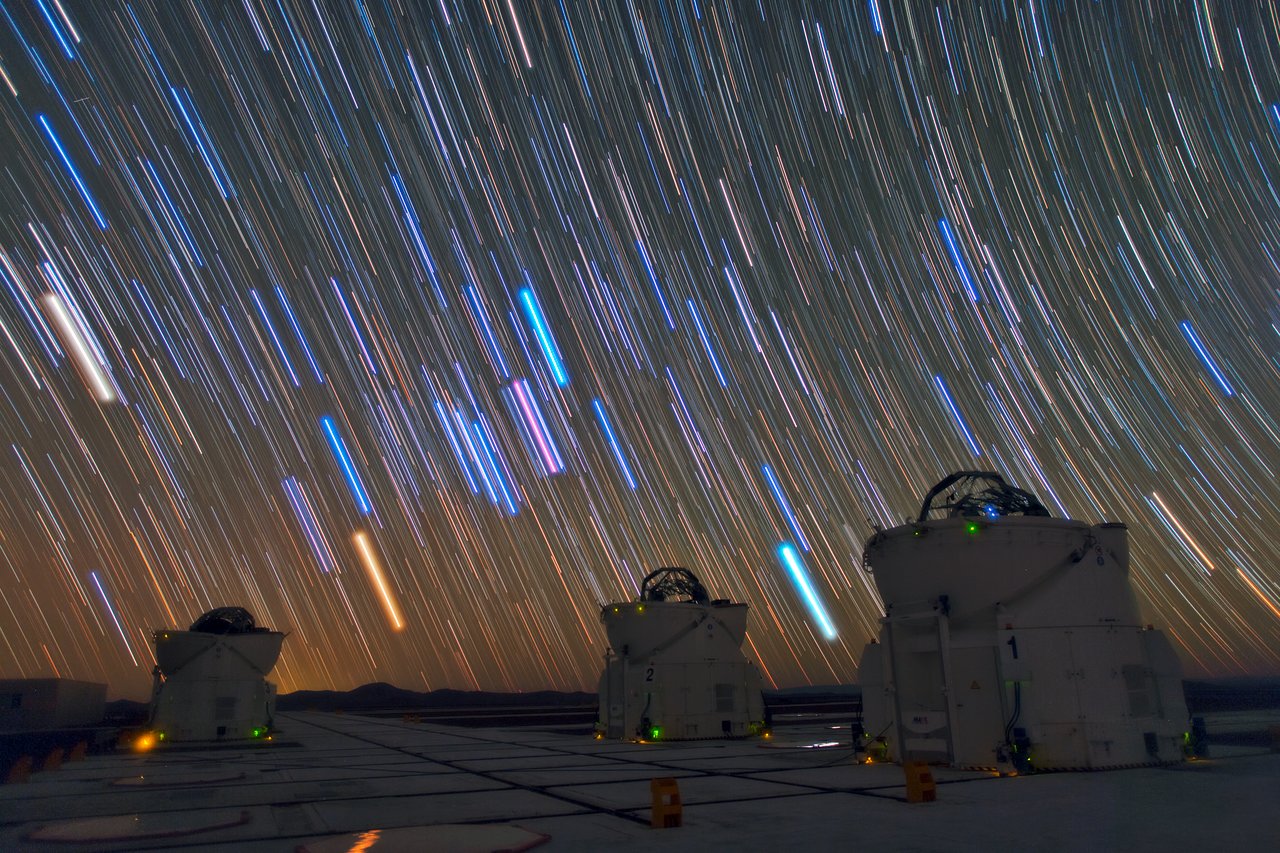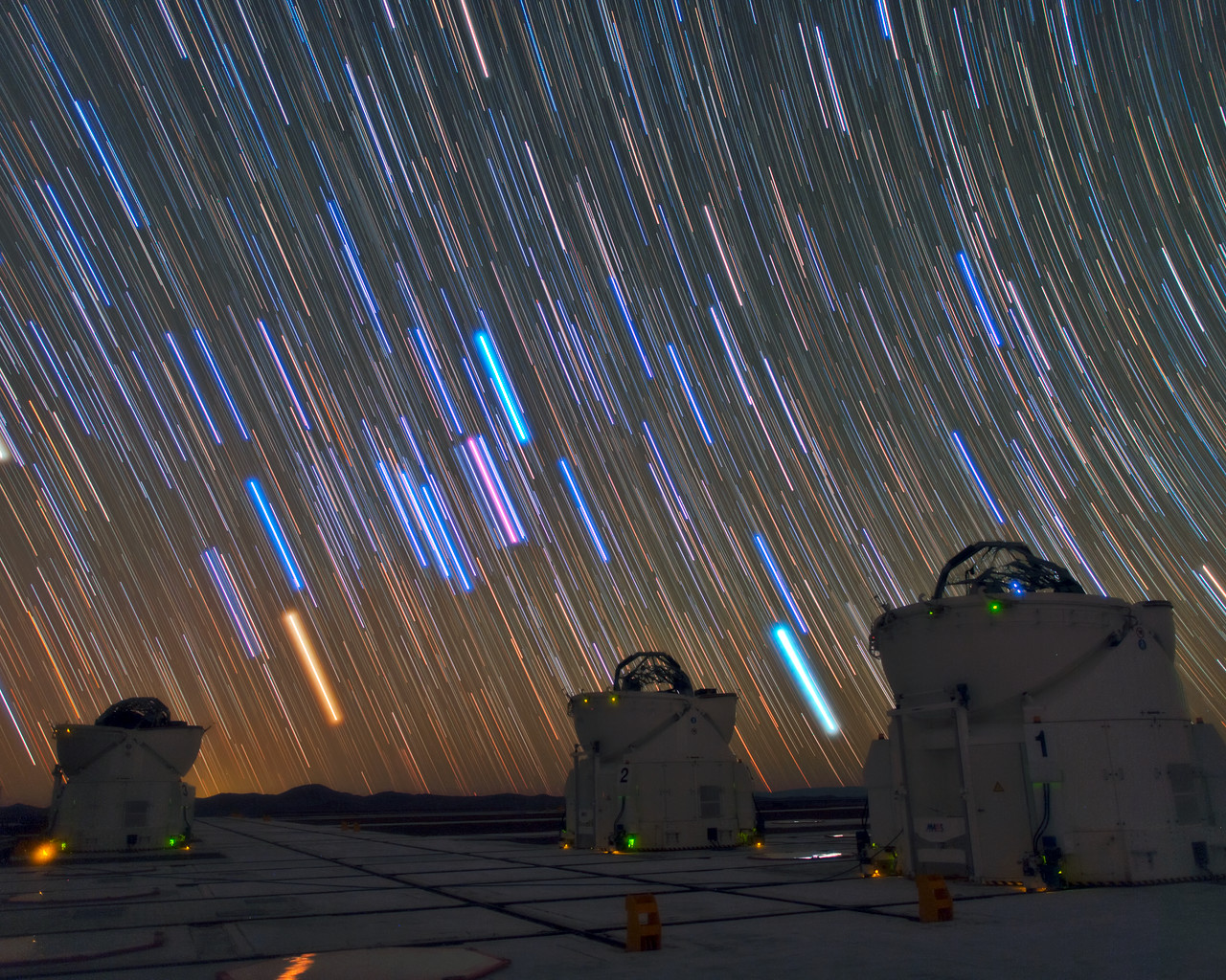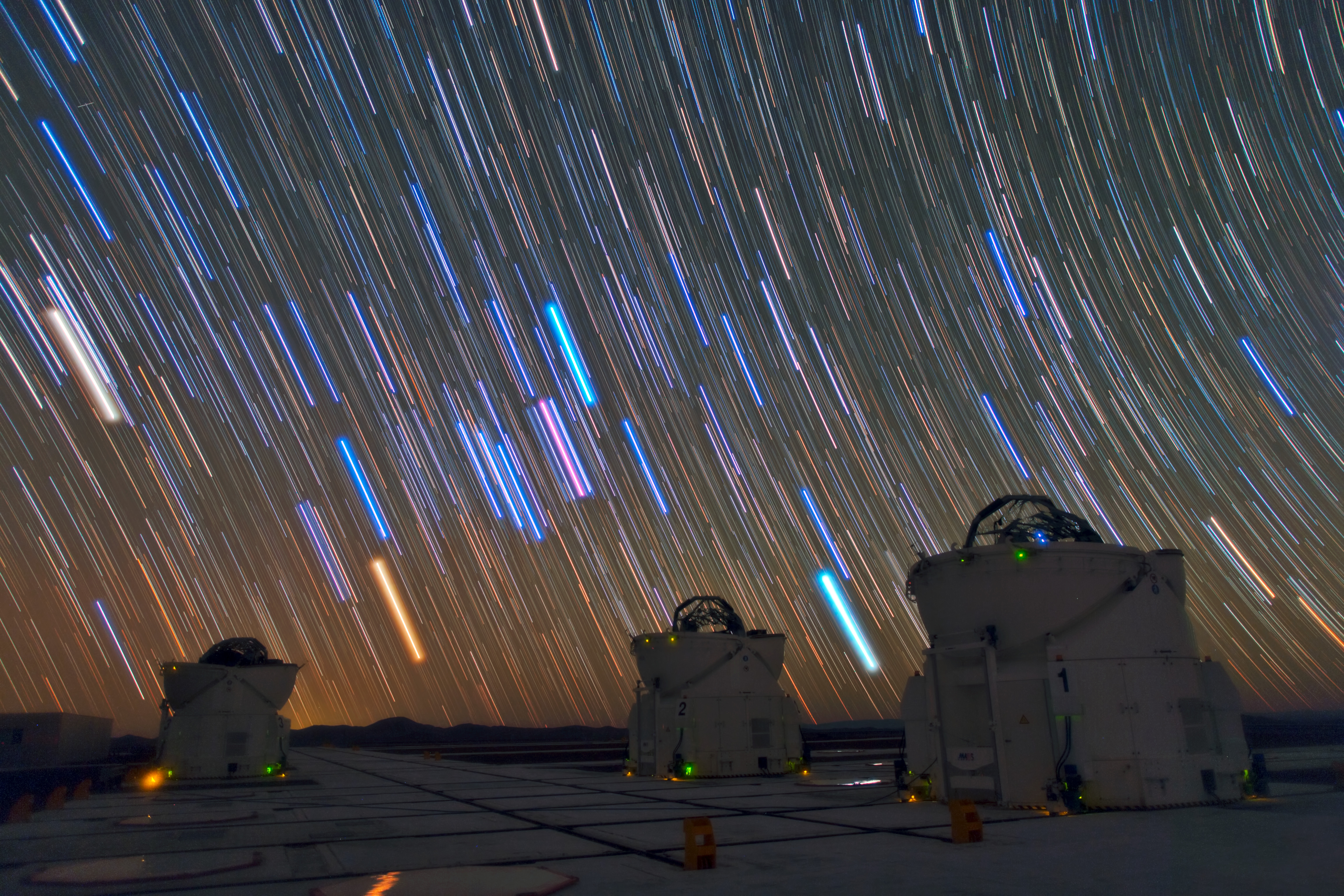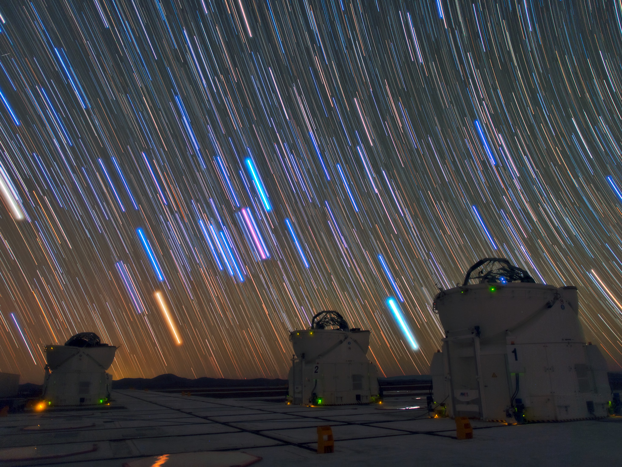 Bilden togs vid ESO:s Paranalobservatorium av Babak A. Tafreshi, som är en av ESO:s fotoambassadörer. Bilden visar tre av de fyra hjälpteleskopen (AT) vid Very Large Telescope Interferometer (VLTI). De långa ljusa ränderna ovanför teleskopen är så kallade stjärnspår, där varje linje visar den skenbara vägen som en stjärna följer över natthimlen som en följd av jordens rotation. Fotograferingstekniken förstärker också stjärnornas naturliga färger, som ger en fingervisning om deras temperatur. De varierar mellan omkring 1000 grader Celsius för de rödaste stjärnorna till tiotusentals grader Celsius för de blåa stjärnorna som är varmast. Vid det avlägsna och högt belägna observatoriet i Chile är himlen mycket klar och det finns inga ljusföroreningar, vilket gör detta spektakulära skådespel möjligt.