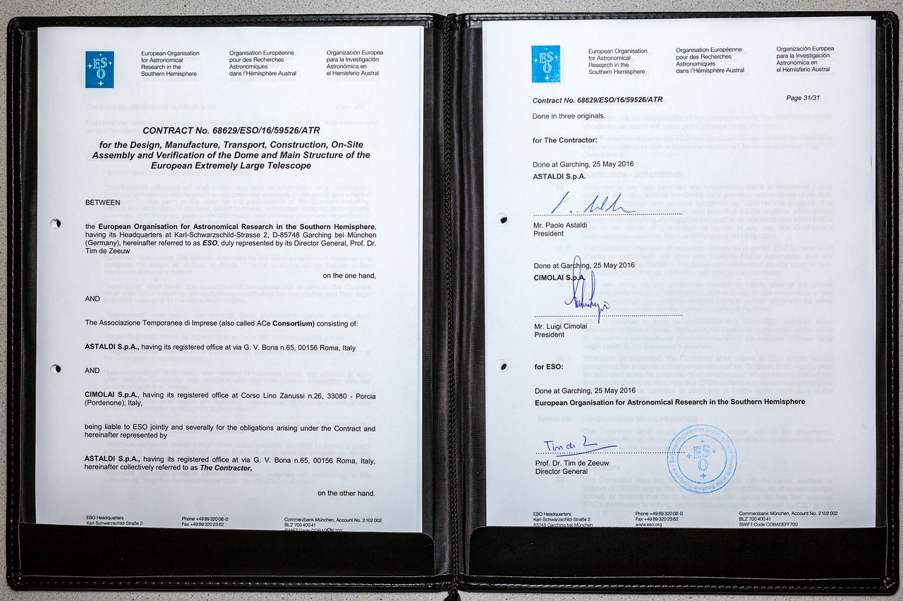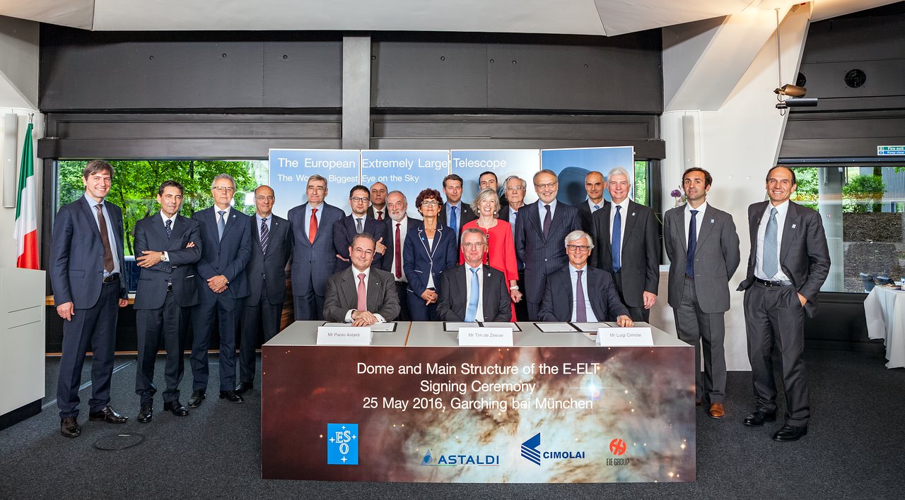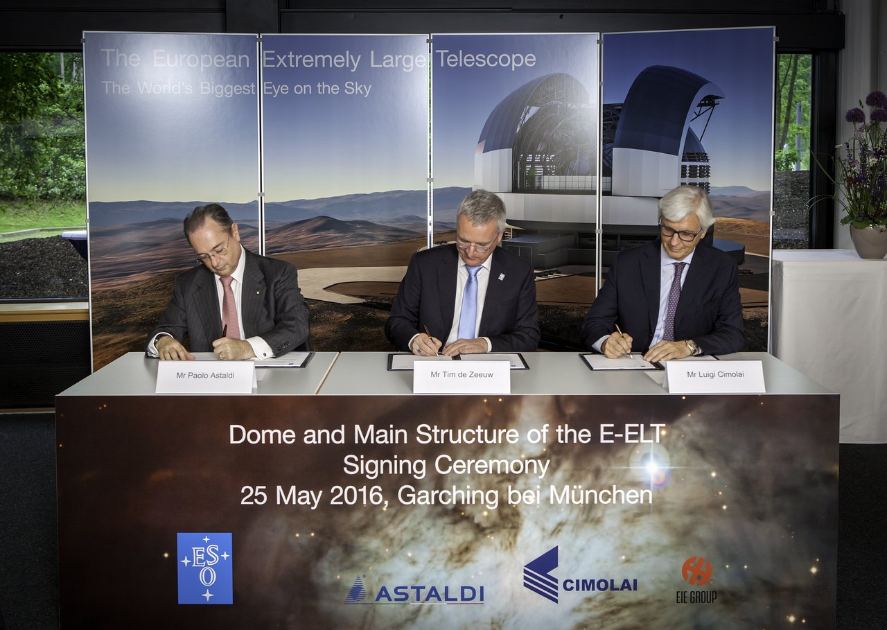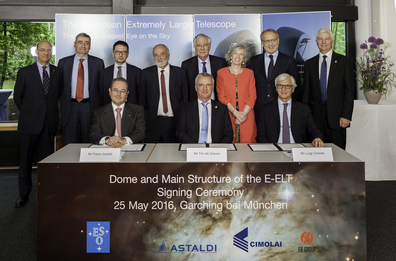Vid en ceremoni i Garching utanför München, Tyskland, den 25 maj 2016, skrev ESO på ett kontrakt med ACe-konsortiet, som består av Astaldi, Cimolai och underleverantören EIE Group, för byggandet av kupolen och teleskopstrukturen för European Extremely Large Telescope (E-ELT). Detta är det största kontraktet som ESO hittills tilldelat och också det största kontraktet för markbaserad astronomi. Vid detta tillfälle avslöjades också byggnadsdesignen för E-ELT. Byggandet av kupolen och teleskopstrukturen kommer nu att påbörjas.