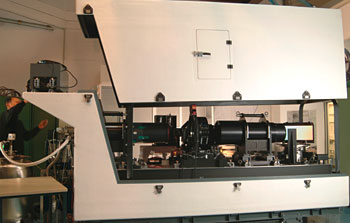 27 mars 2003: The initial commissioning period of the new HARPS spectrograph (High Accuracy Radial Velocity Planet Searcher) of the 3.6-m telescope at the ESO La Silla Observatory has been successfully accomplished in the period February 11 - 27, 2003. This new instrument is optimized to detect planets in orbit around other stars ("exoplanets") by means of accurate (radial) velocity measurements with an unequalled precision of 1 meter per second . This high sensitivity makes it possible to detect variations in the motion of a star at this level, caused by the gravitational pull of one or more orbiting planets, even relatively small ones. "First Light" occurred on February 11, 2003, during the first night of tests. The instrument worked flawlessly and was fine-tuned during subsequent nights, achieving the predicted performance already during this first test run. The measurement of accurate stellar radial velocities is a very efficient way to search for planets around other stars. More than one hundred extrasolar planets have so far been detected , providing an increasingly clear picture of a great diversity of exoplanetary system. However, current technical limitations have so far prevented the discovery around solar-type stars of exoplanets that are much less massive than Saturn, the second-largest planet in the solar system. HARPS will break through this barrier and will carry this fundamental exploration towards detection of exoplanets with masses like Uranus and Neptune. Moreover, in the case of low-mass stars - like Proxima Centauri - HARPS will have the unique capability to detect big "telluric" planets with only a few times the mass of the Earth. The HARPS instrument is being offered to the research community in the ESO member countries, already from October 2003.